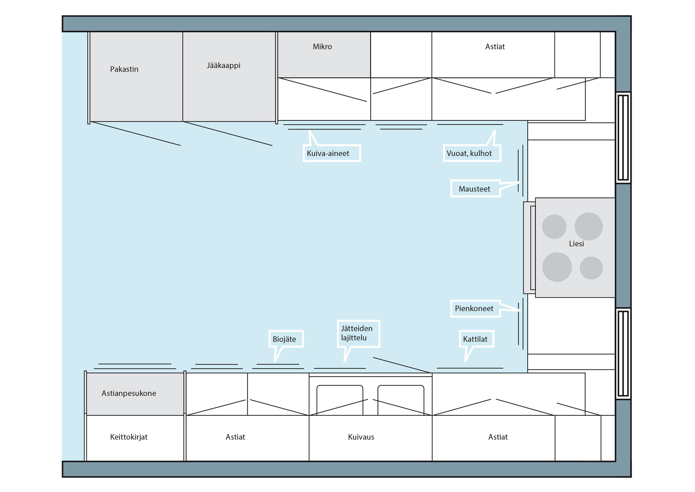 - Ovien ja luukkujen avautumissunnat kannattaa huomioida paitsi toimivuuden myös kulkuväylien kannalta.