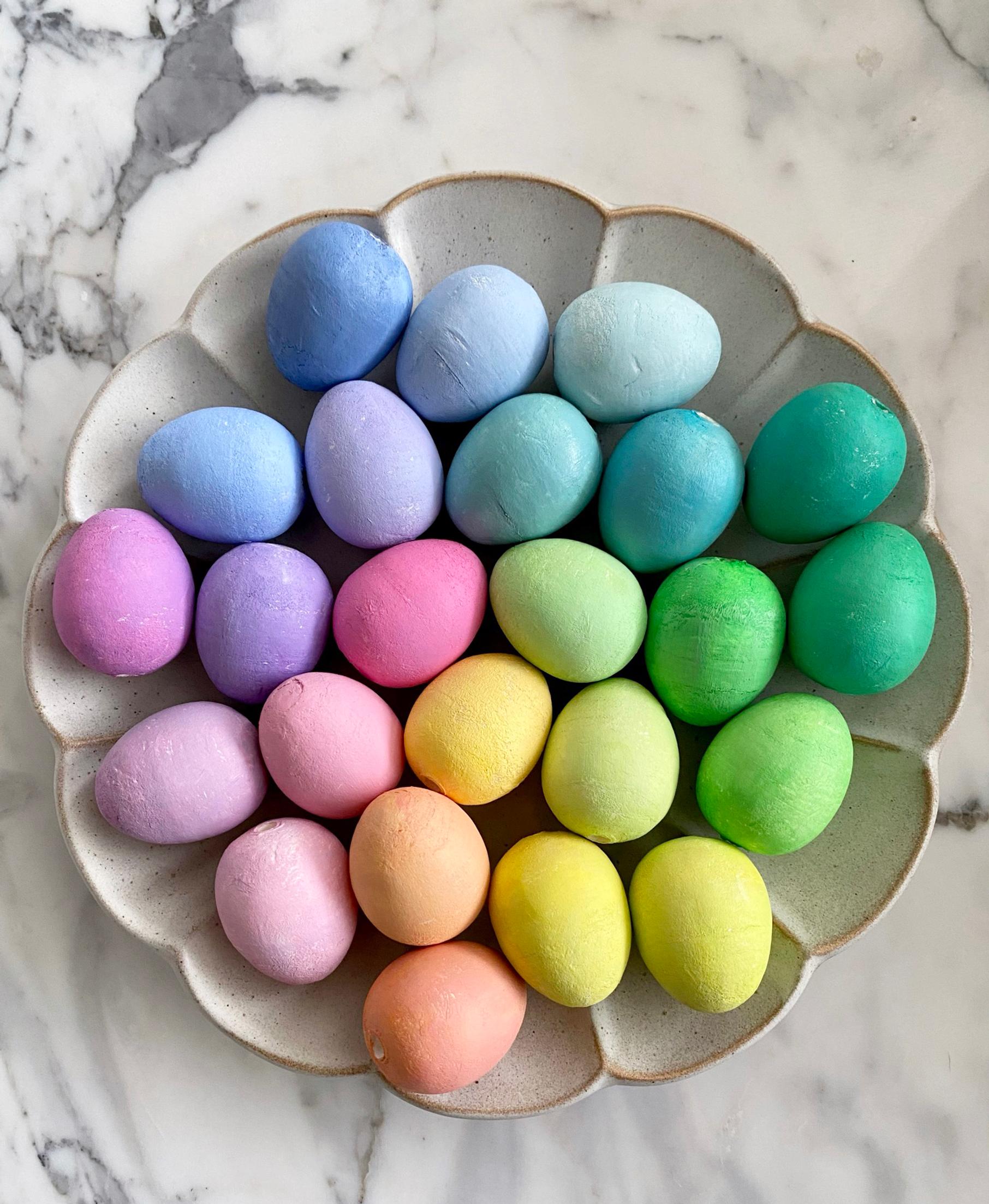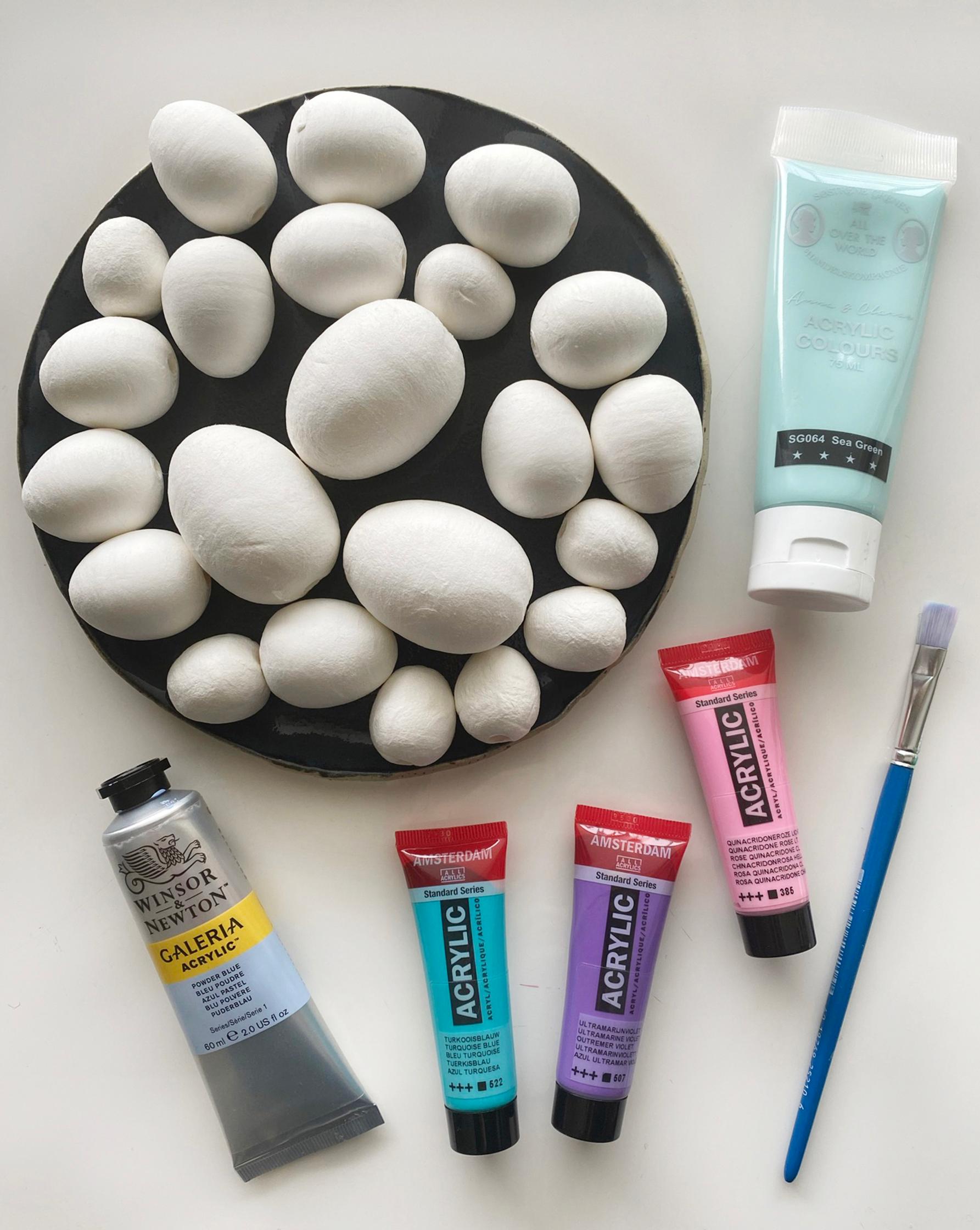 1. Maalaa paperimassamunat haluamasi sävyisiksi. Sateenkaarisävyt saa aikaan perusväreillä: tarvitset sinistä, punaista, keltaista ja valkoista. Näitä sekoittamalla ja valkoisen määrää lisäämällä saa kirkkaita välivärejä ja pastellisia sävyjä. Jos haluat mukaan paljon murrettuja sävyjä, niin varaa valkoista maalia reilummin, sillä sitä kuluu eniten. Anna munien kuivua hyvin.