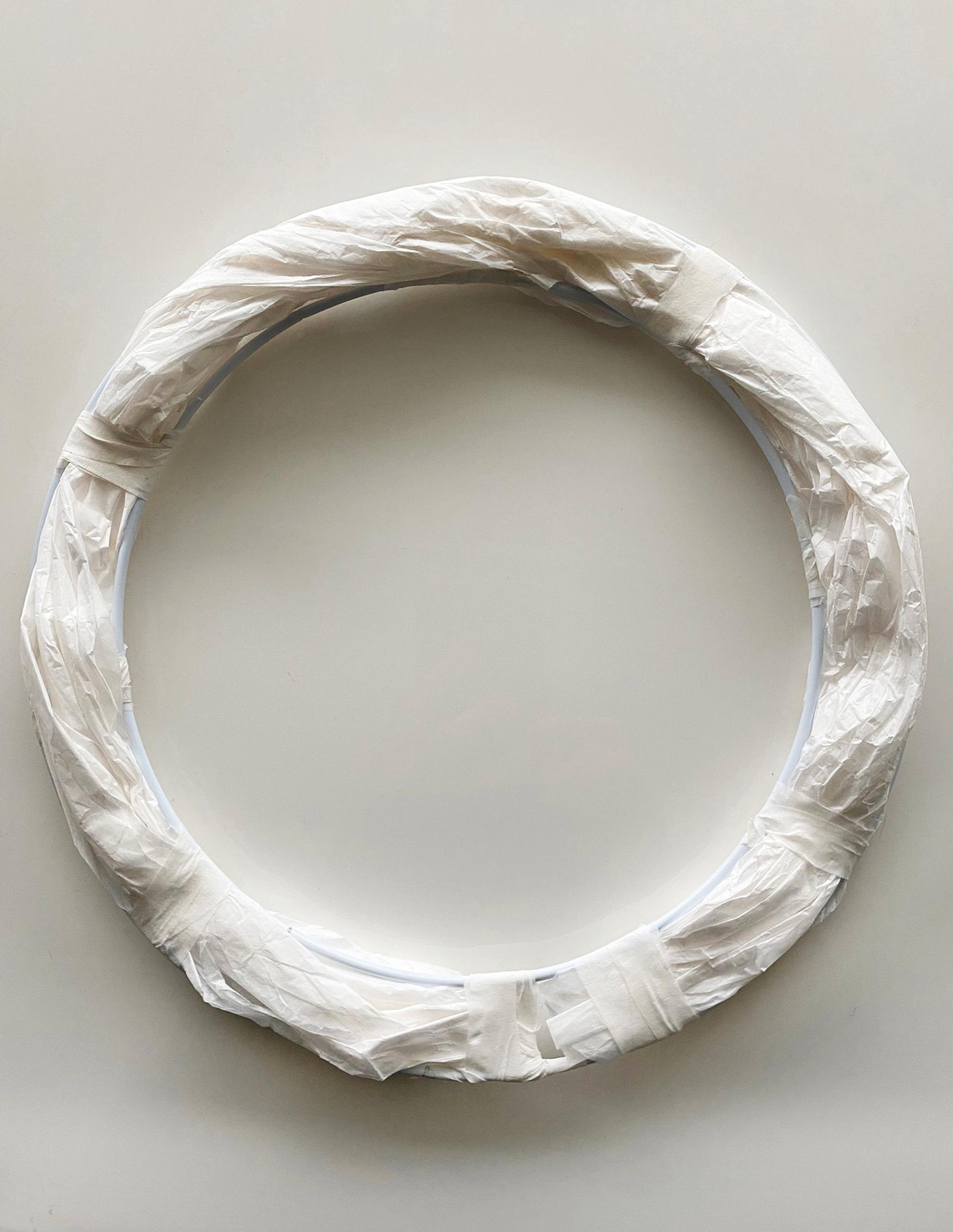 3. Ota pari silkkipaperiarkkia ja rutistele ne pötköksi. Pärjäät yhdellä pötköllä, jos käytät halkaisijaltaan korkeintaan 25-senttistä rengasta. Pujota pötkö renkaiden väliin niin, että se kulkee joka toisen kiinnityskohdan yli ja joka toisen ali. Halutessasi voit lisätä teippiä myös muihin kohtiin, jotta paperi kiinnittyy tukevasti renkaiden väliin.