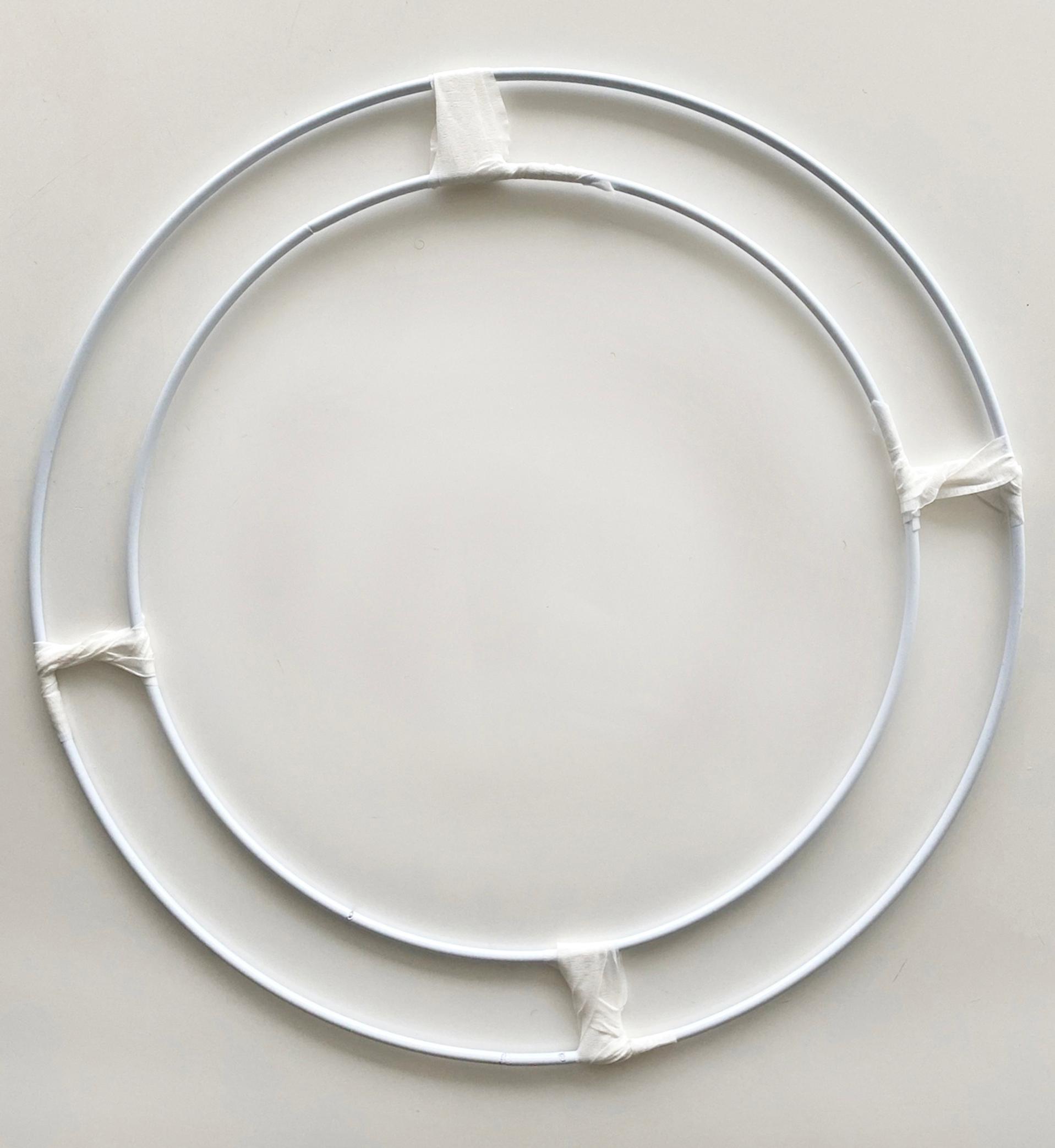 2. Valmistele kranssin pohja. Aseta pienempi metallirengas isomman sisään ja kiinnitä renkaat teipillä toisiinsa muutamasta kohdasta.