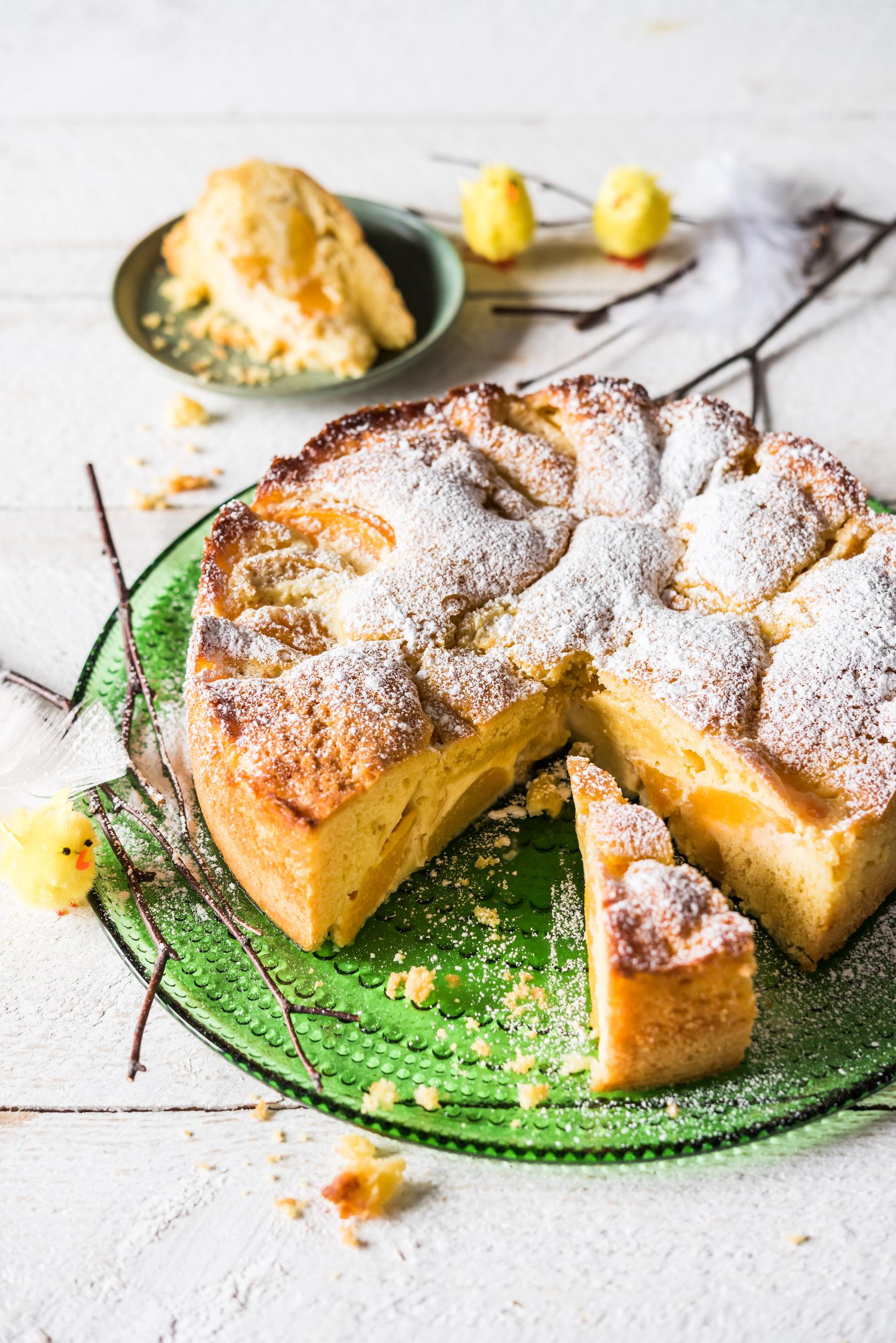 Keväinen persikkatorttu sopii hyvin pääsiäisen juhlapöytään. Tortun kanssa maistuu vaniljakastike tai -jäätelö.