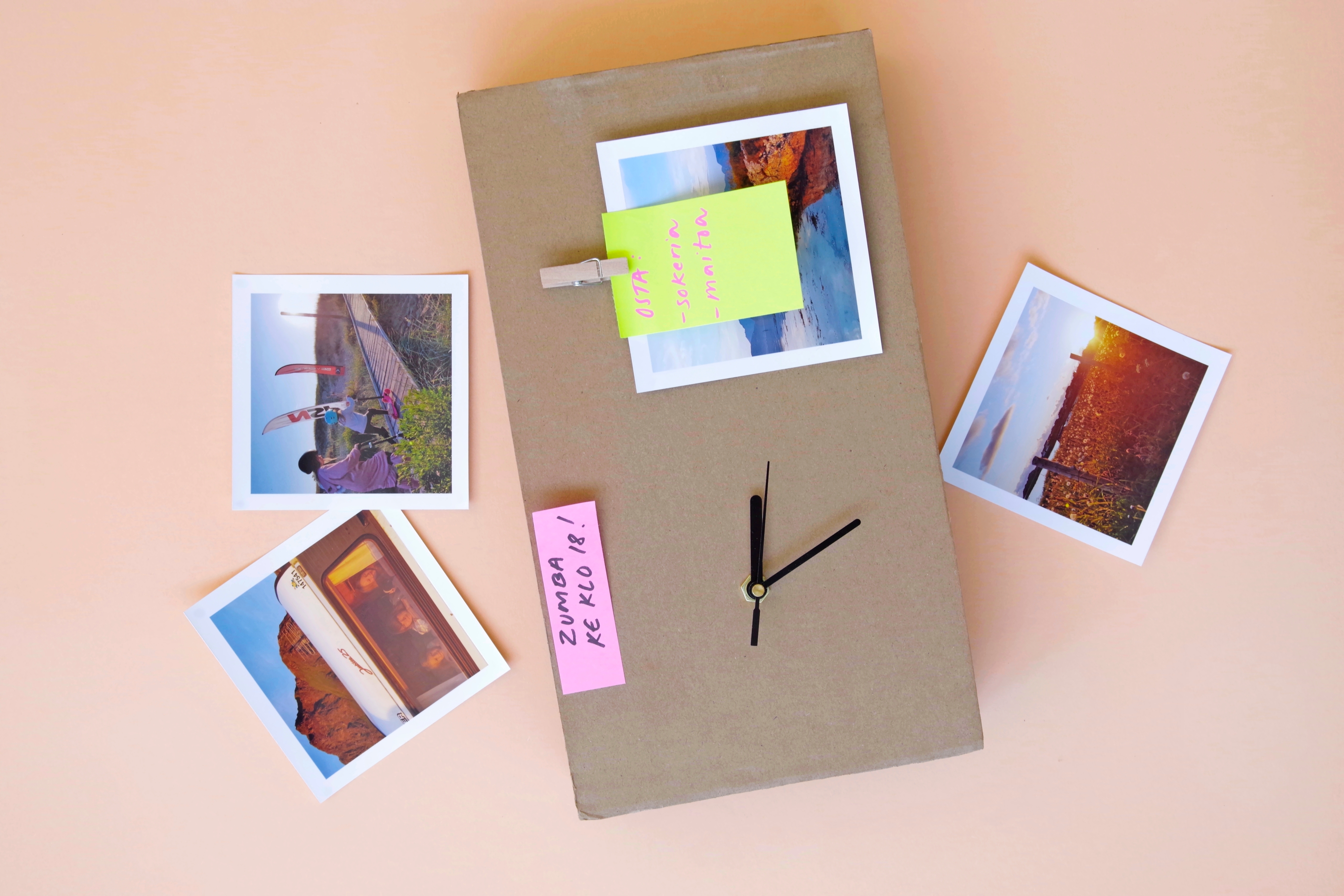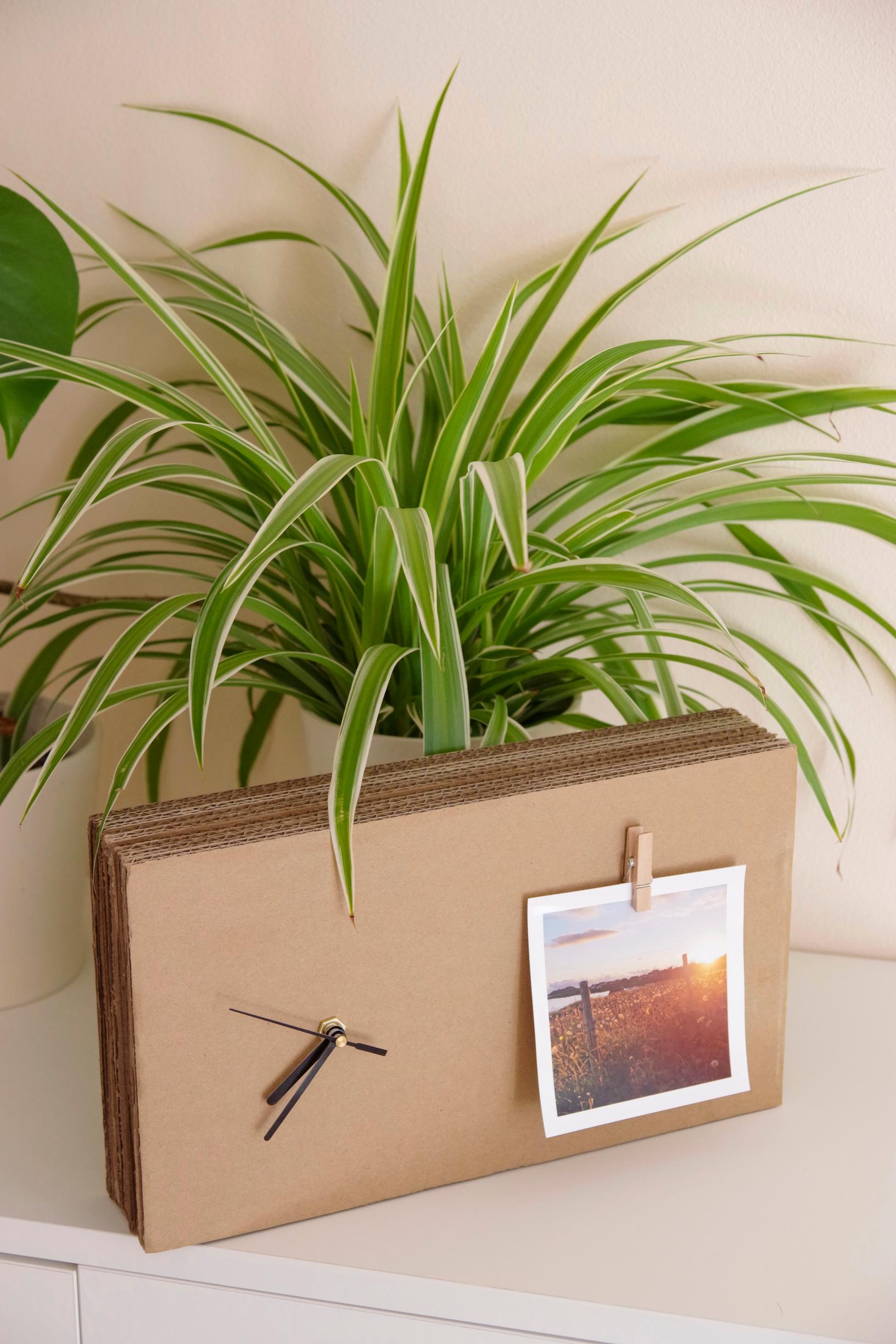 Askartele kierrätyspahvista pöytäkello, jonka yksinkertainen muoto on helppo toteuttaa. Viisarien rinnalla on tilaa valokuvalle.