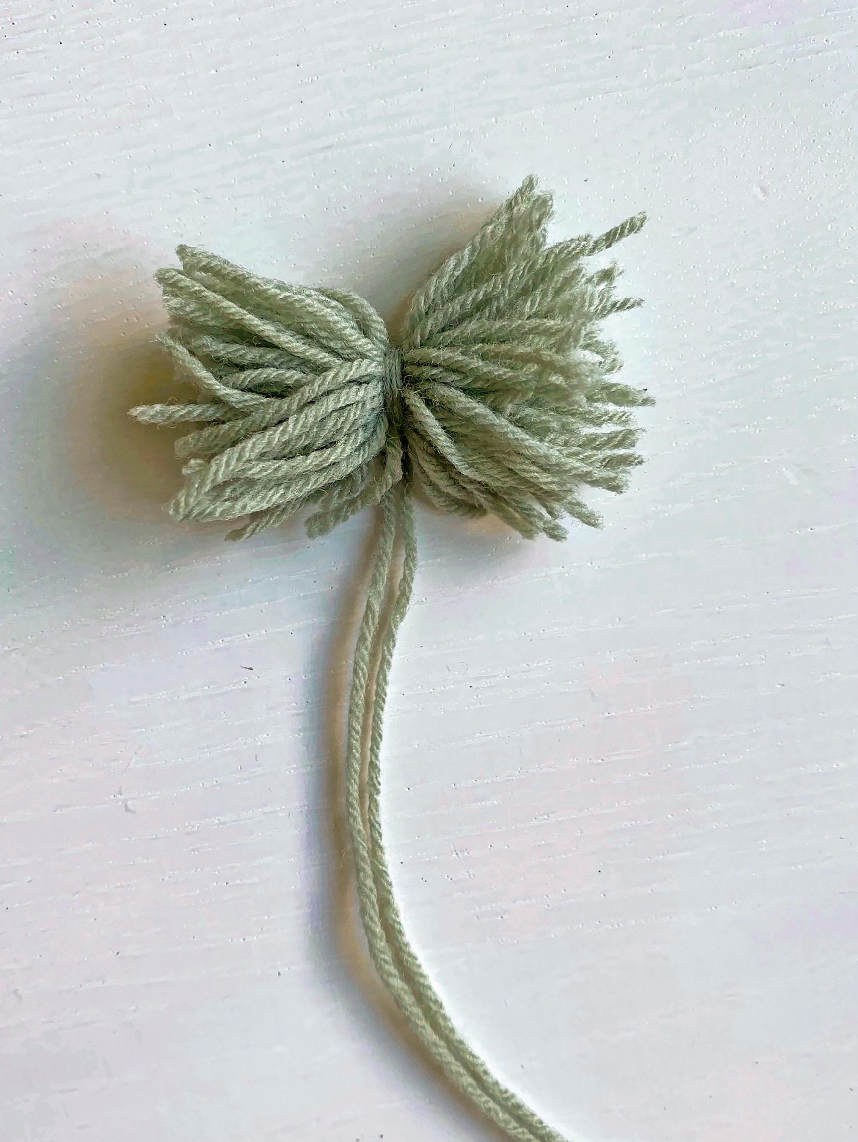 2. Leikkaa ripustuslanka samasta langasta ja tee umpisolmu vyyhdin ympärille. Leikkaa langat auki ja tasoita tarvittaessa.