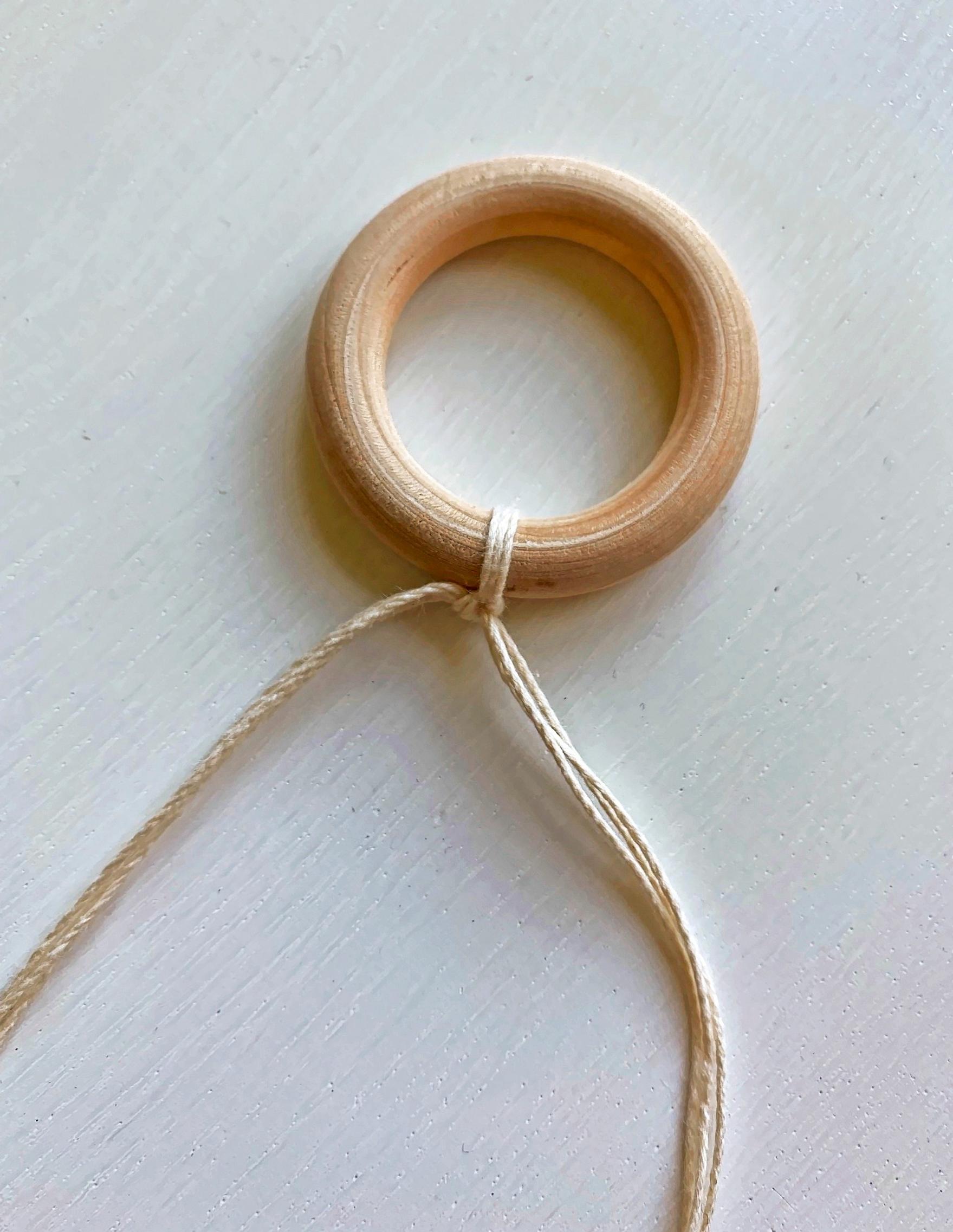 2. Leikkaa kalalangasta kolme 2 metrin pituista lankaa ja kiinnitä ne puolestavälistä umpisolmulla puurenkaaseen ( = 6 lankaa).