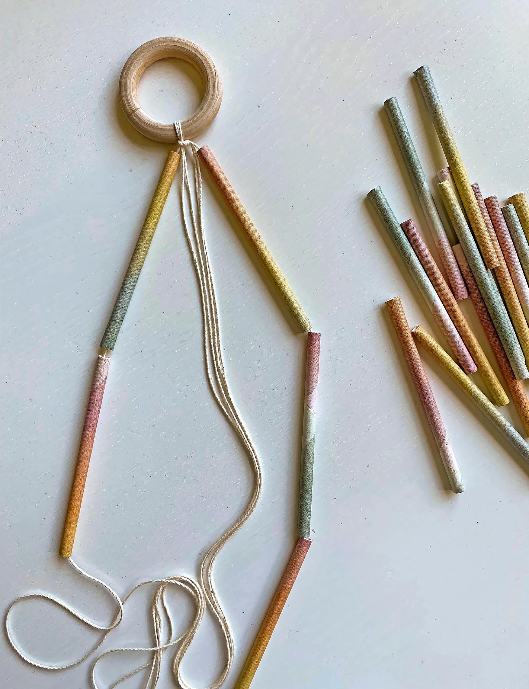 3. Leikkaa yhdeksän pilliä puoliksi (= 18 palaa). Pujota jokaiseen lankaan kolme puolikasta pilliä. Pillit pysyvät paikoillaan, kun langan päähän laittaa stopiksi pienen pyykkipojan tai klipsin.