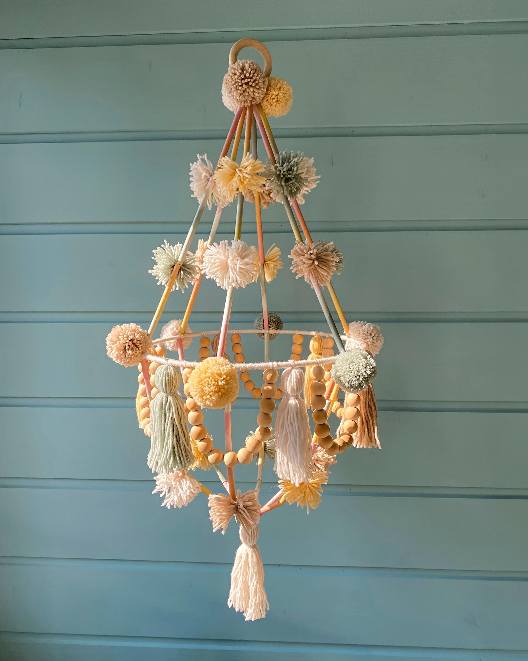 8. Kiinnitä kolme tupsua puurenkaan alle ja kuusi tupsua metallirenkaaseen pillien kohdalle.