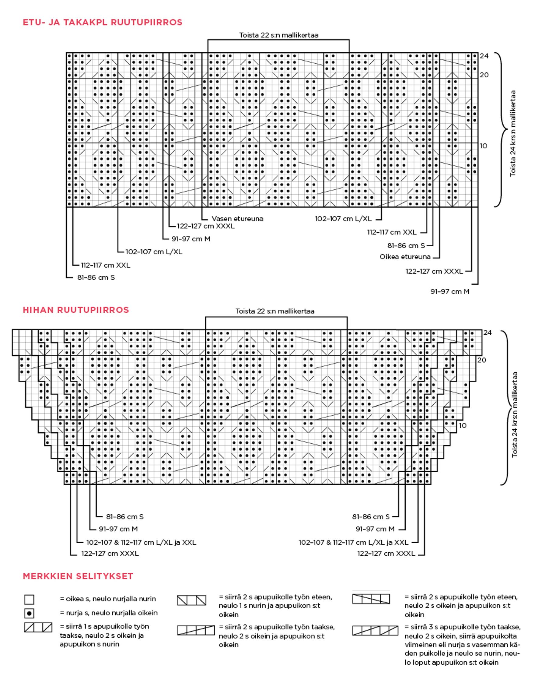 Palmikkoneuleet: Neulo ruutupiirrosten ja ohjeen mukaan. Toista krs:ia 1.–24.