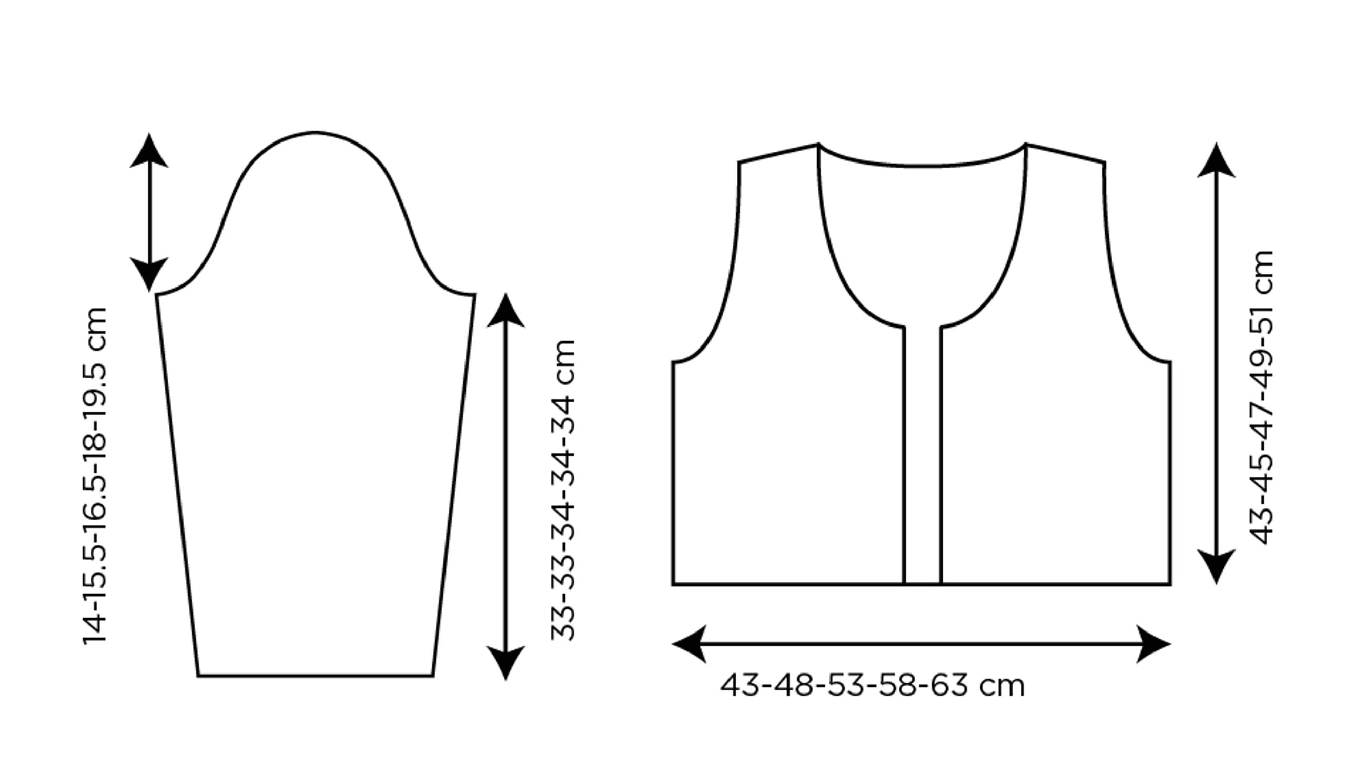 - Kun kappaleen korkeus on 21-21-22-22-23 cm, päätä molemmissa reunoissa kädentietä varten ensin 1x3-4-5-6-7 s, kavenna sitten molemmissa reunoissa joka krs 7-11-11-13-13x1 s ja joka 2. krs 4-4-5-5-6x1 s = 95-99-109-117-127 s. Kun kädentien korkeus on 19-21-22-24-25 cm, jätä keskimmäiset 41-41-45-45-47 s pääntietä varten odottamaan ja neulo ensin toinen puoli.