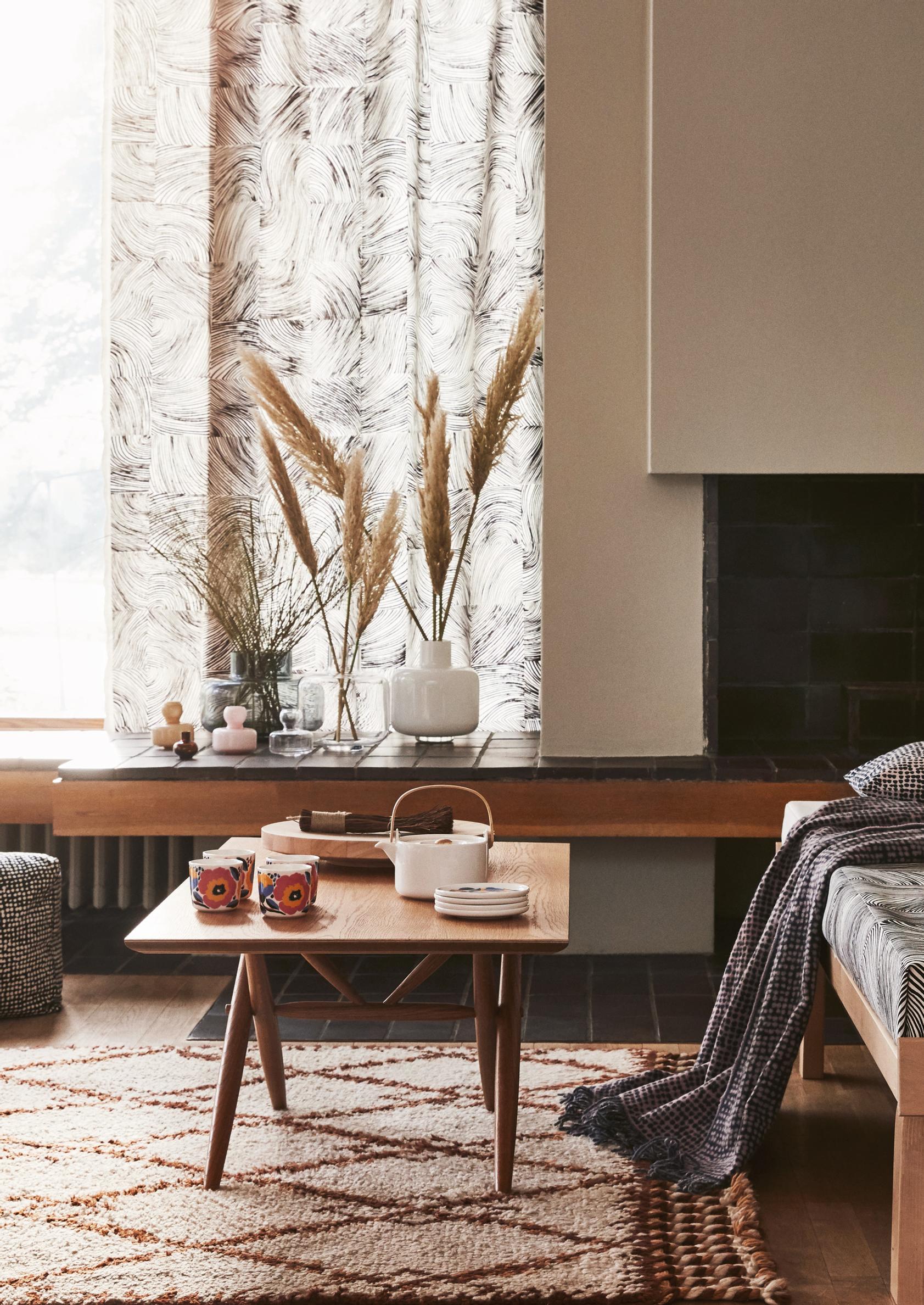 Pampaheinä on kaunis myös vaakatasossa. Herkullisessa kattaussommitelmassa on yhdistelty ihanasti luonnonmateriaaleja, puuta, kiveä ja keramiikkaa. Ruskean ja harmaan sävyillä saat seesteistä tunnelmaa sisustukseen.