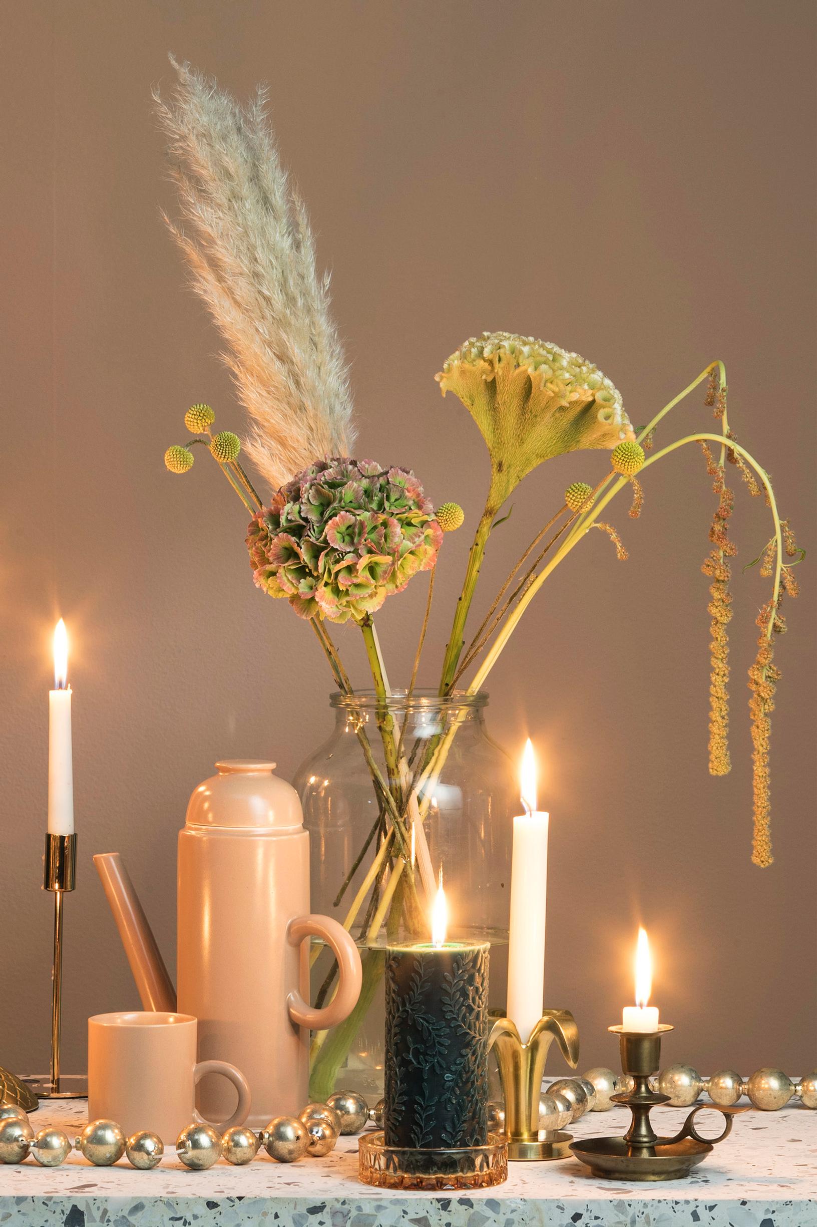 Pampaheinä sopii myös jouluiseen kahvipöytään. Tee säväyttävä kimppu ja laita koristeheinä samaan lasivaasiin jalohortensian, kukonharjan ja revonhännän seuraksi. Kynttilät ja metallihelmet tuovat asetelmaan sopivasti kimallusta.