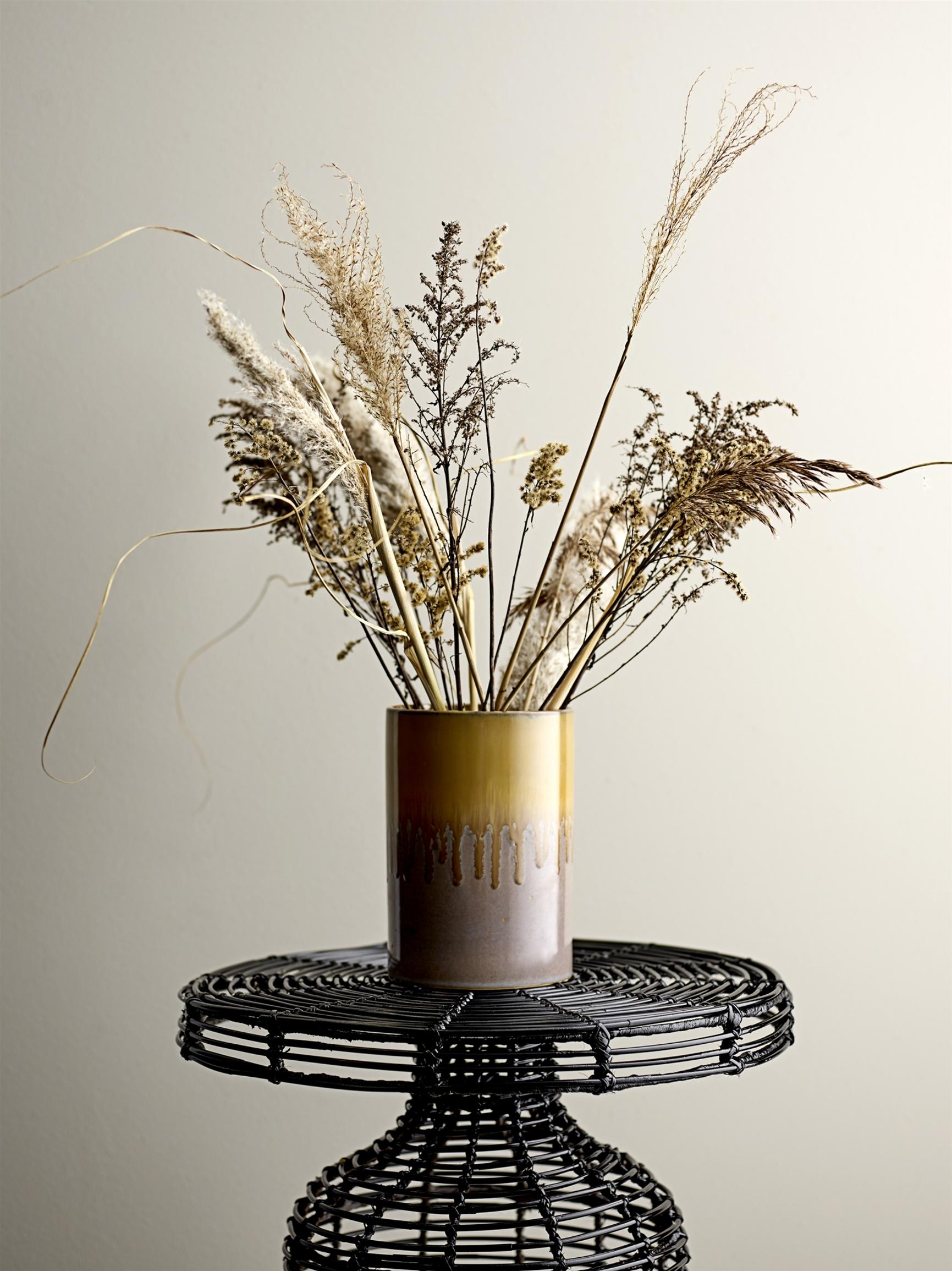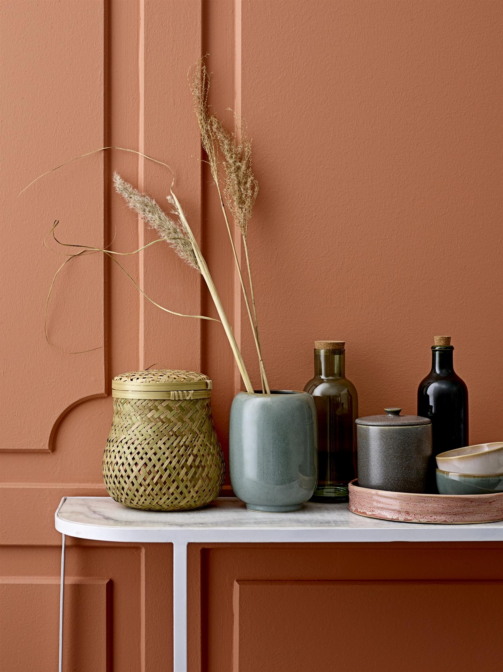 Koristeheinistä ei tarvitse tehdä tuuheaa kimppua. Muutama huolettomasti aseteltu pampaheinä tekee keraamisista vaaseista ja lasipulloista koostuvasta asetelmasta sopivan boheemin. Vihreät ja ruskeat sekä terrakotan väriset vaasit sopivat hyvin neutraalin väristen koristeheinien pariksi.