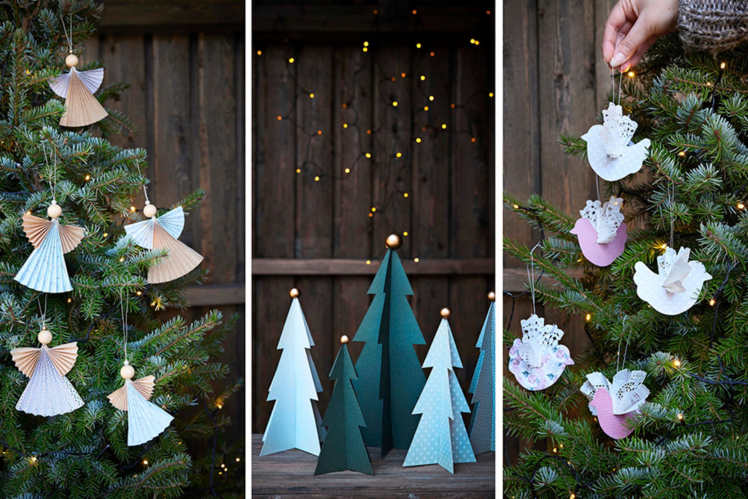 Taittele klassiset paperikokoristeet kuusenoksille. Moderni ilme syntyy raikkailla kuoseilla ja seesteisillä sävyillä.