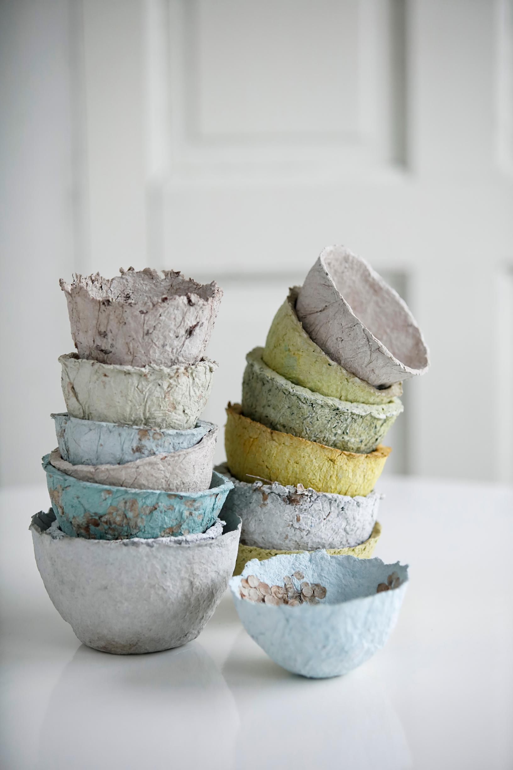 Tee sanomalehdistä paperimassaa ja värjää se pigmenteillä tai vaikka kurkumalla, pinaatilla ja punajuurella. Massaa on helppo muovailla vaikka kulhoiksi.