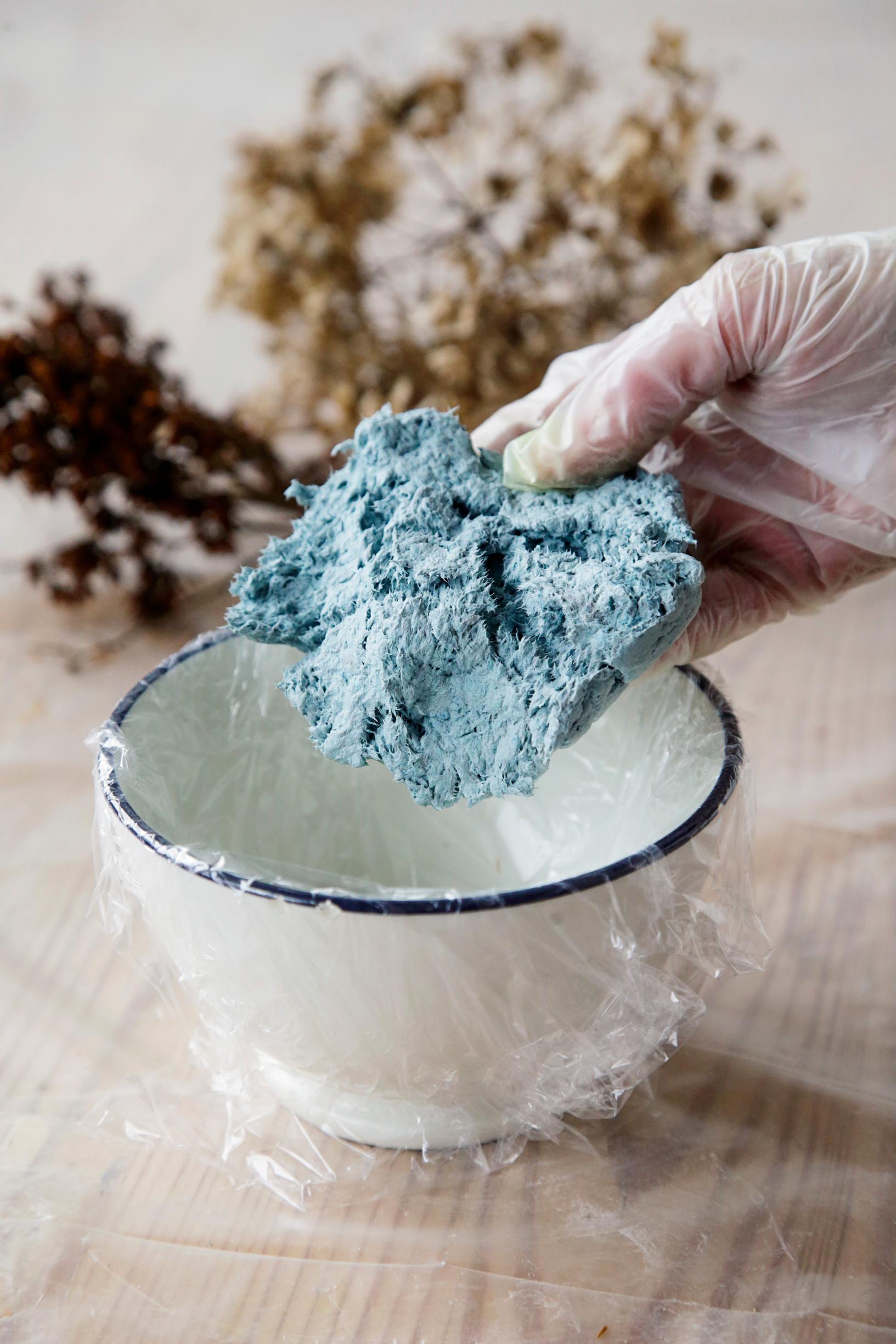 4. Kokeile värjäykseen myös keittiöstä löytyviä väriaineita, esimerkiksi kurkumajauhetta, vahvaa kahvia, pinaatin tai punajuuren keitinvettä, elintarvikeväriä jne. Puristele massasta liiat vedet pois.