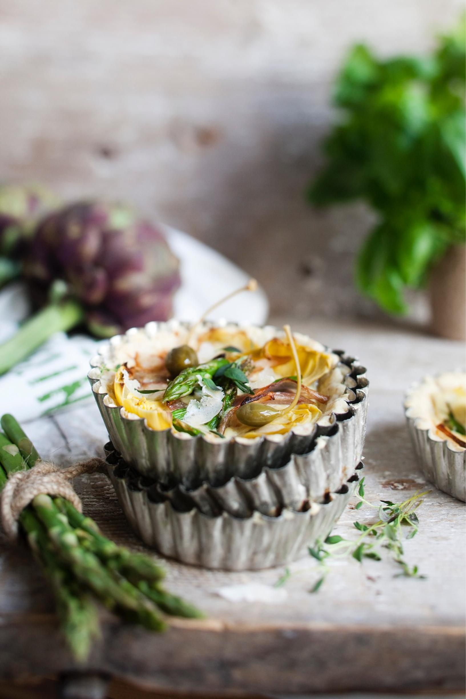 Piirakan voi tietenkin leipoa myös gluteenittomaksi. Tässä versiossa parsapiirakka tehdään pieniin annosvuokiin. Pohjassa makua tuo raastettu juusto. Täytteeksi pikkupiirakoihin sujautetaan parsan lisäksi artisokansydämiä, kuohukermaa ja loraus valkoviiniä, nam!
