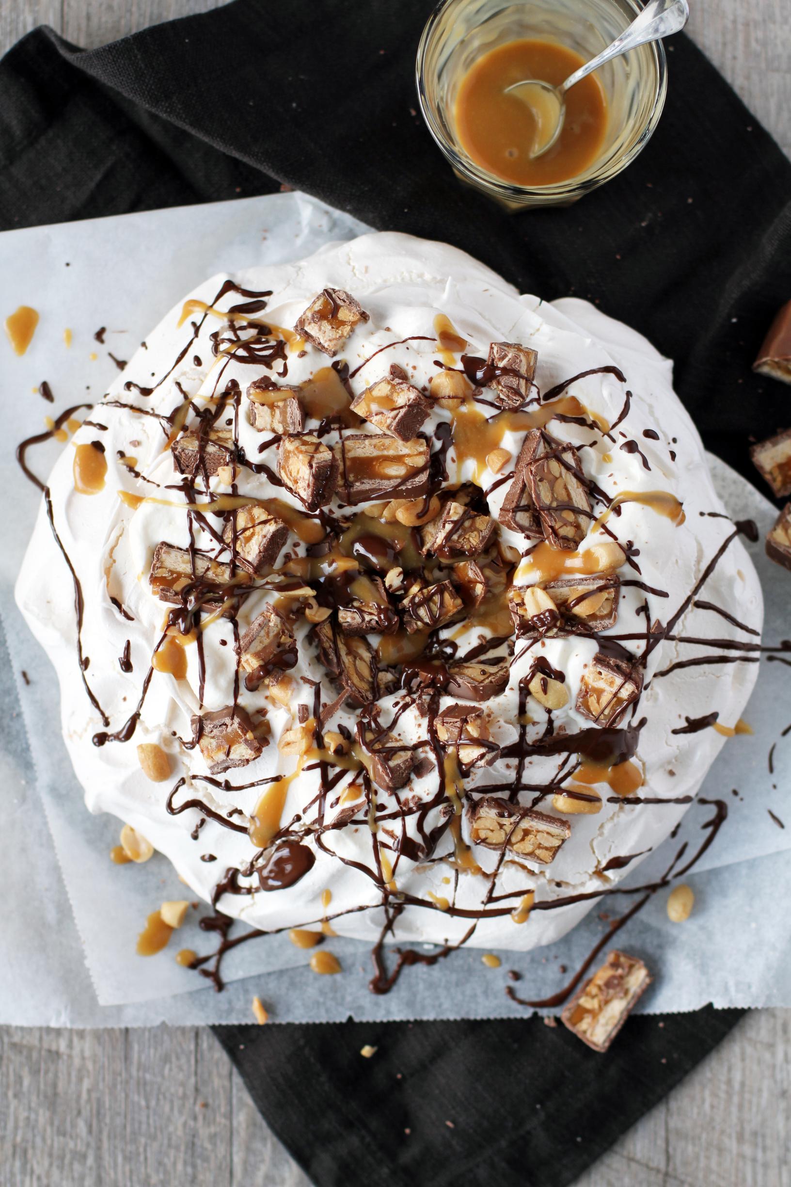 Snickers-suklaapatukoilla koristeltu pavlovakakku on rouskuva päältä ja pehmeä sisältä. Kinuskikastike, sulatettu suklaa ja suolapähkinät – tähän kakkuun ei voi kun hullaantua! Kinuskikastikkeen voit tehdä itse tällä ohjeella tai yhtä hyvin voit käyttää kaupan valmista kastiketta. Snickers-pavlovan ohjeen löydät täältä!