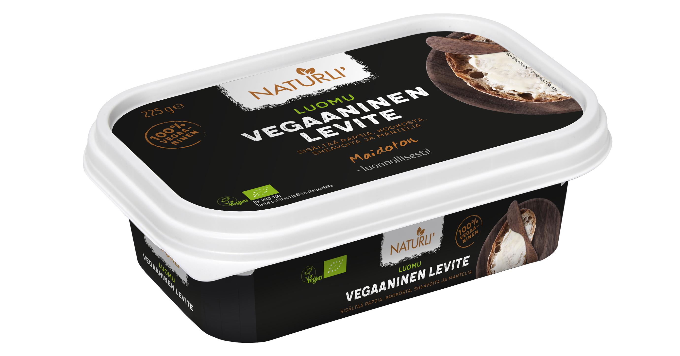 ”Naturli Luomu -vegaaninen levite on loistotuote: maku, rakenne, monipuolinen käyttö, pakkauskoko ja hinta täsmäävät. Erityisesti maku saa pisteet, on kuin voita, vaikkei seassa ole mitään eläinperäistä. Vaahtoutuu hyvin leivonnaisten teossa!” kehuu Riitta. Tuote on valmistettu rapsista, kookoksesta sheavoista ja mantelista.