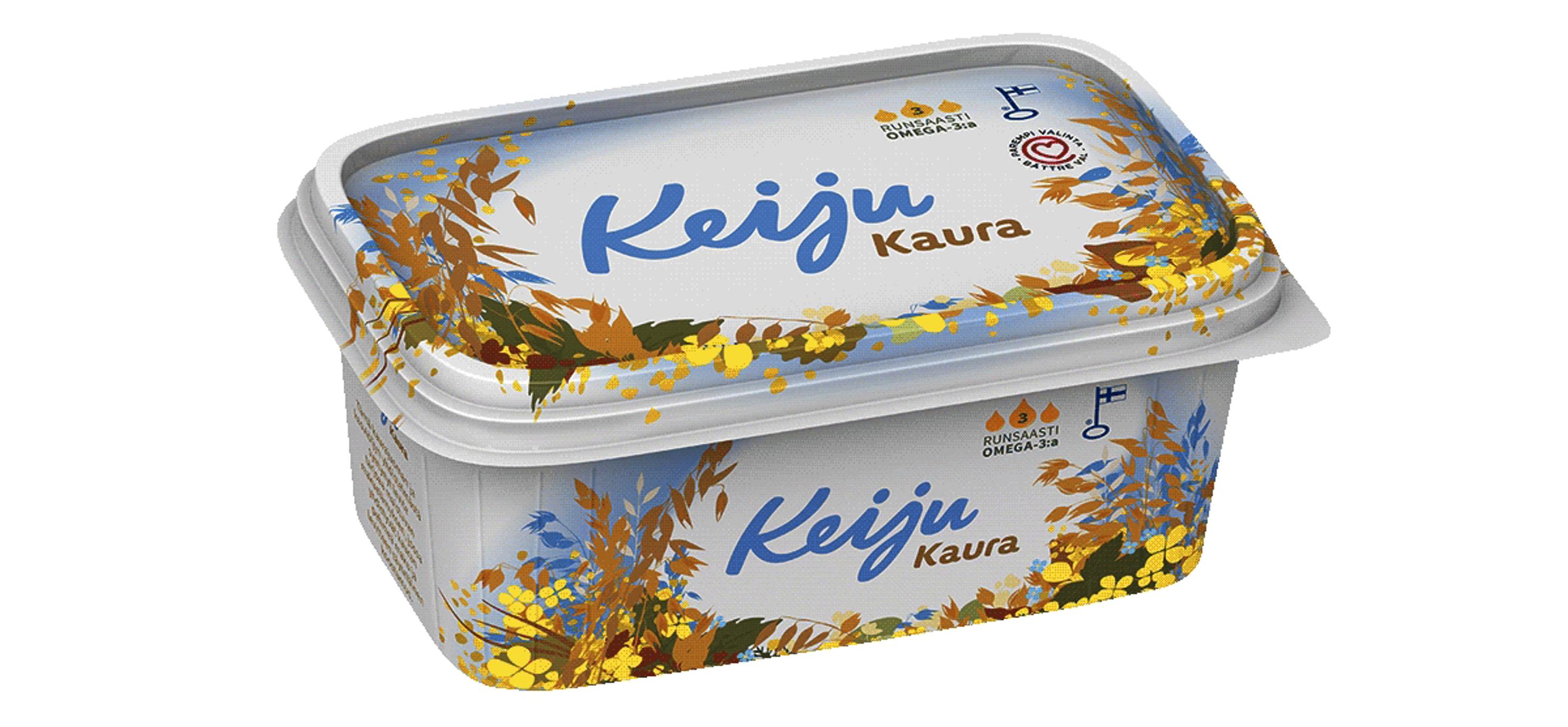 ”Keiju Kaura -rypsiöljymargariini on todella maukas ja päihittää myös useimmat ei-vegaaniset margariinit!” perustelee Karoliina. Kaurajuomasta ja rypsiöljystä valmistettu levite on pakattu kartonkipäällysteiseen rasiaan.