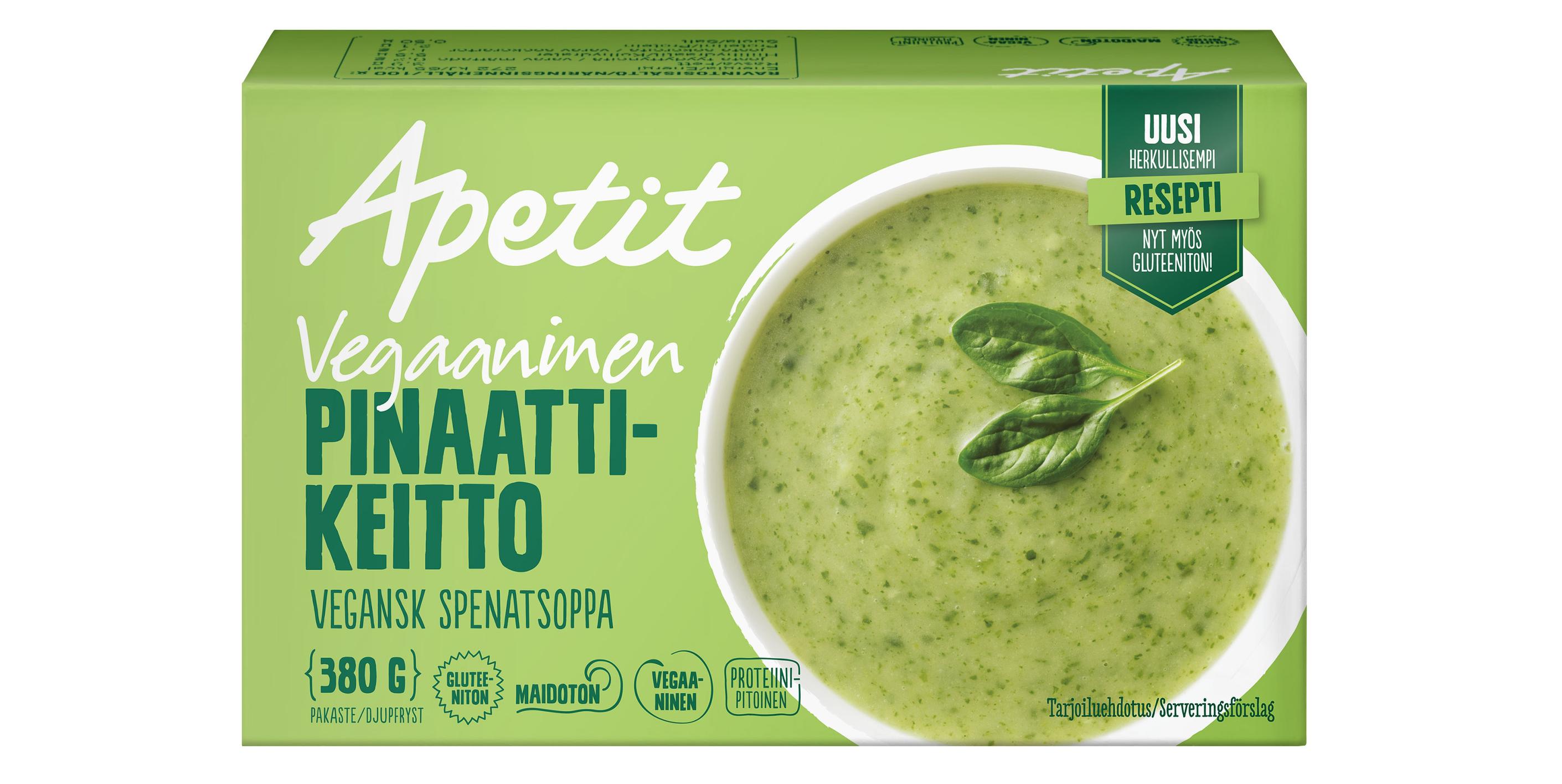 ”Pinaattisoppa ilman niitä turkasen klimppejä, namia. Tällä vaan on kysyntää, joten ei aina löydy hyllystä”, Maku-lukija Emmi ylistää. Apetit Vegaaninen -pinaattikeitto on terveellinen mutta maistuva pelastus etenkin kiireisiin päiviin.