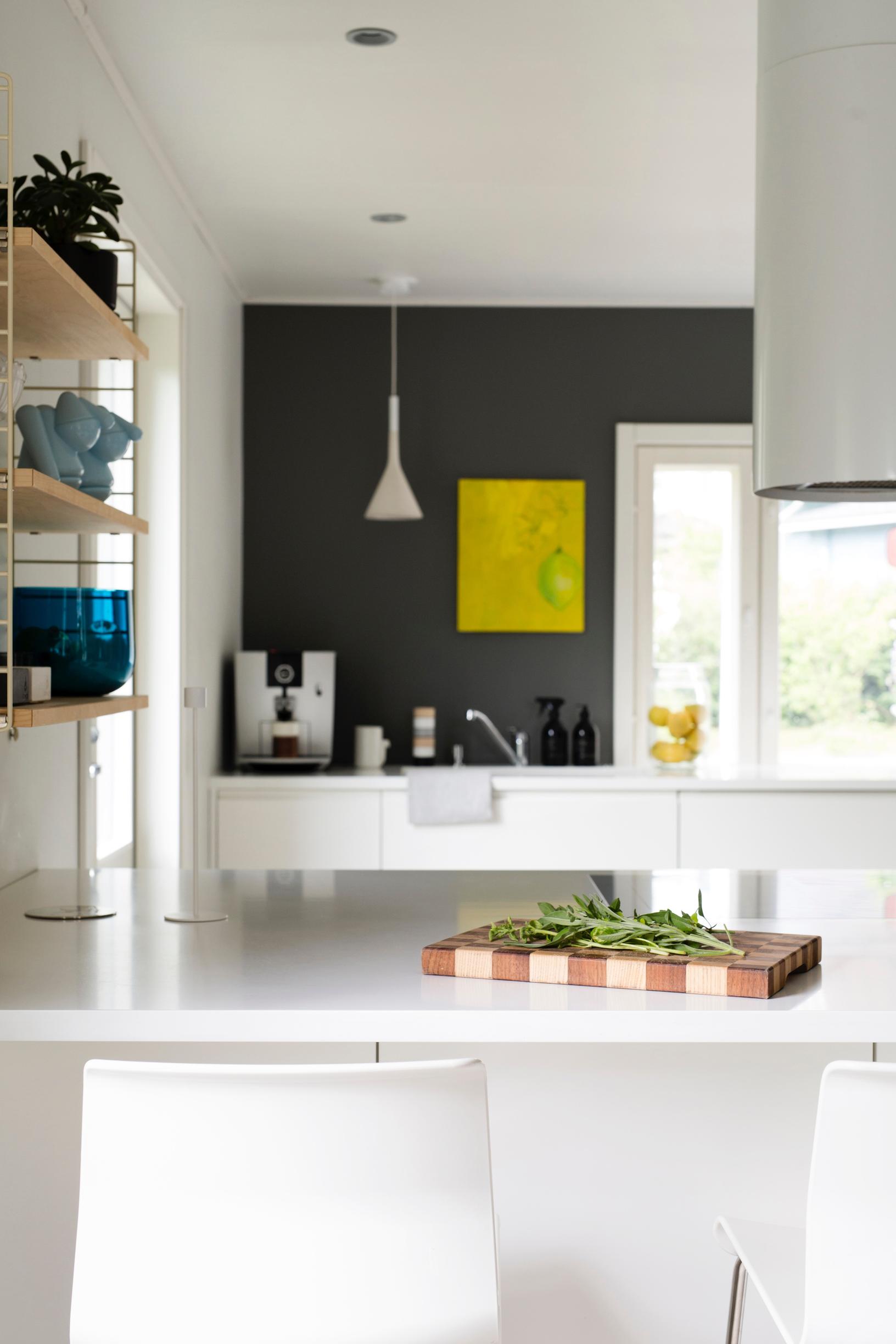 Terhi ja Kalle haaveilivat alunperin aivan toisenlaisesta, uudesta talosta. Sisustussuunnittelijana työskentelevä Terhi on sisustanut kodin skandinaaviseen tyyliin, muttei minimalistisesti.