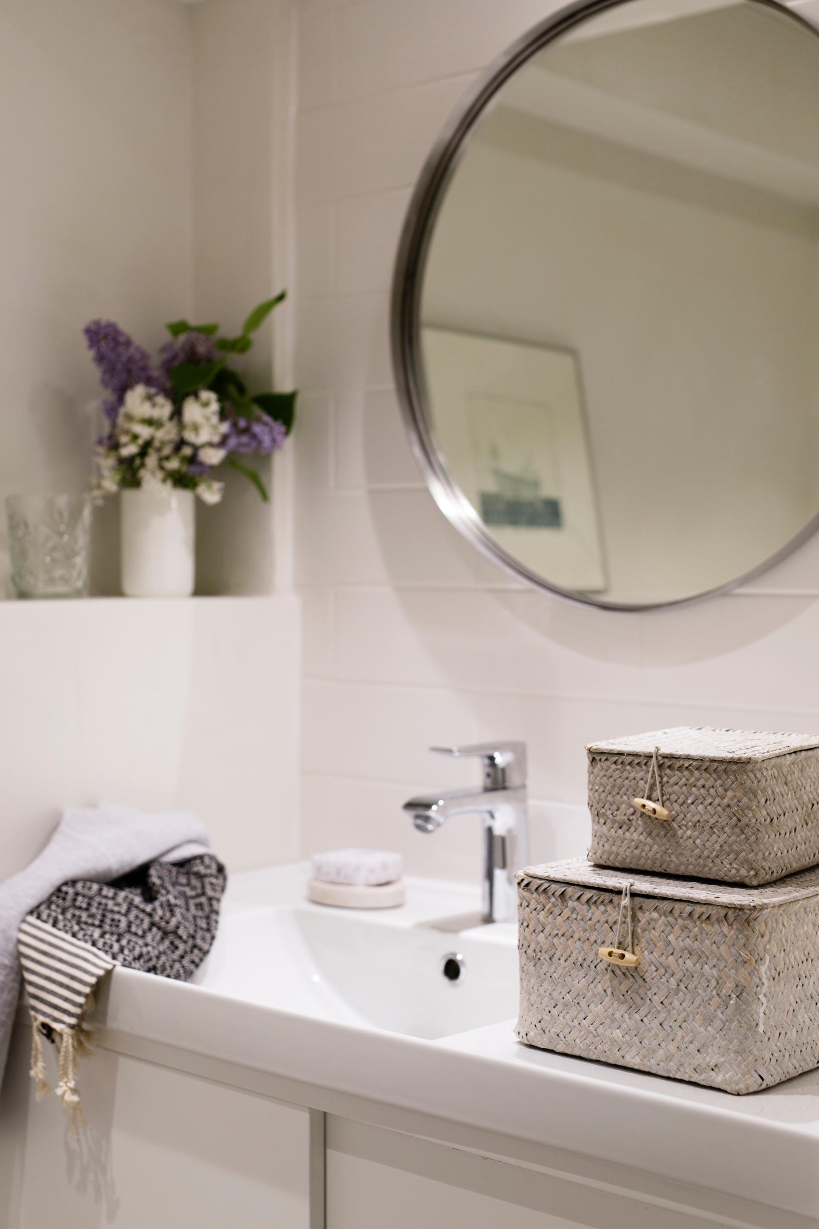 Olohuoneeseen muuton jälkeen kesti vielä puolitoista vuotta, ennen kuin remontti valmistui – vaikka työssä kului kaikki lomat ja vapaa-ajat. Viimeiseksi valmistui yläkerran wc, jonka pintamateriaalit oli suunniteltu jo kaksi vuotta aiemmin. Näin viimein yläkertakin sai juoksevan veden. Valkoisessa veskissä on ripaus 50-luvun henkeä modernilla twistillä.
