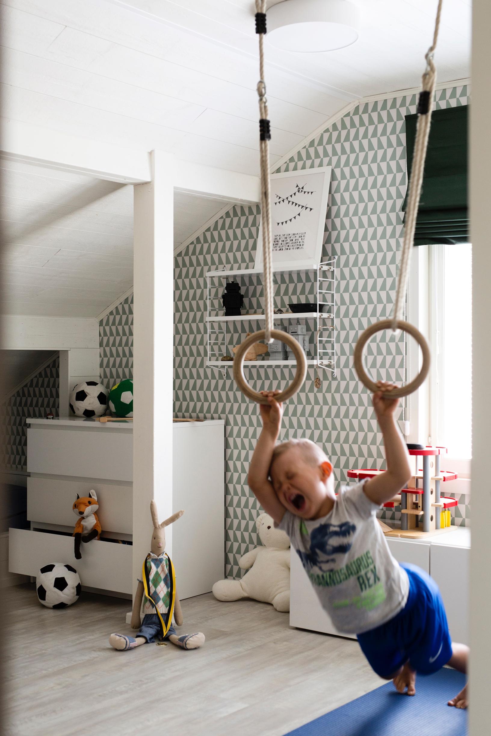 – Olen valinnut kaikki sisustusmateriaalit muistaen, että meillä on kolme poikaa. Esimerkiksi yläkerran vinyylikorkkilattia kestää iskut ja sisälätkän peluun.