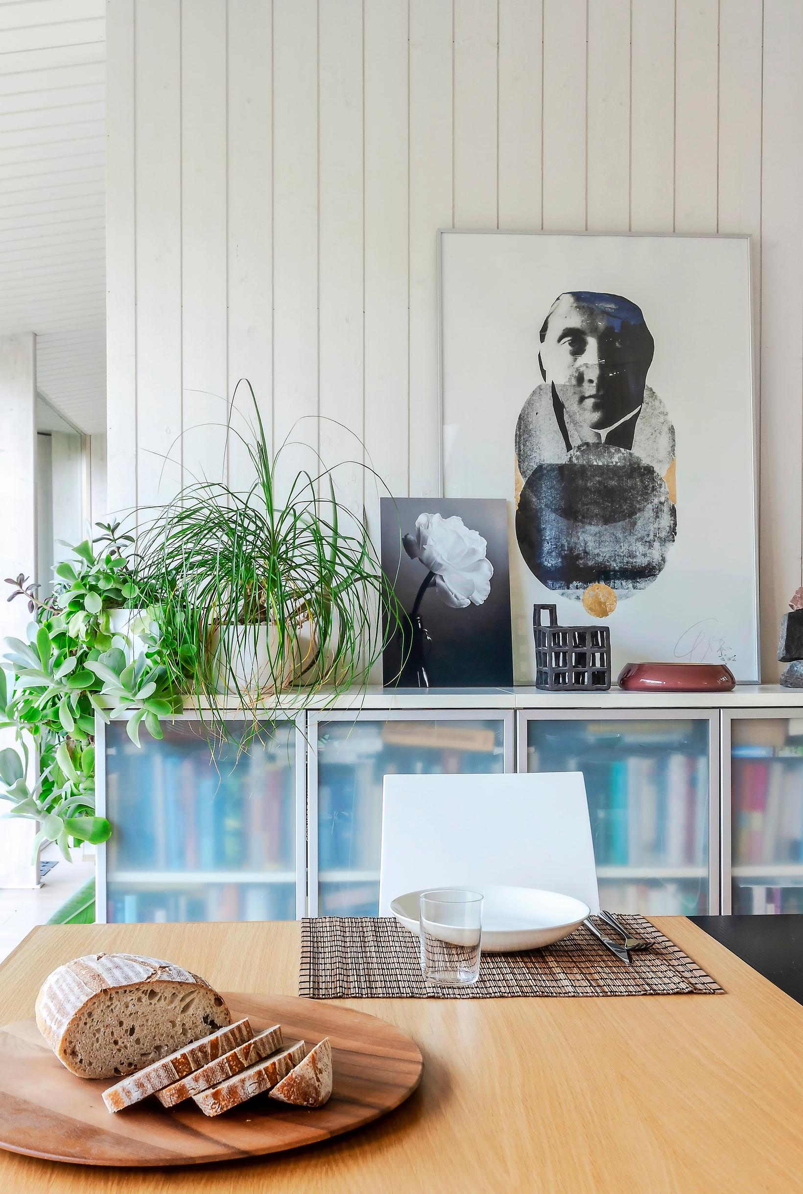Itse leivottua leipää on tarjolla Lundian pöydällä ja taidetta Iskun kaapiston päällä. Seinää vasten lepäävä Marcin Filip Cybulskin uniikkiteos on hankittu Lontoosta suoraan tekijältä. Mustavalkoinen kukkakuva on Suvi Ruotsin. Venla Martikaisen keraaminen talo hankittiin rakennusaikana. Matala lasikulho on Tanja Sipilän prototyyppi.