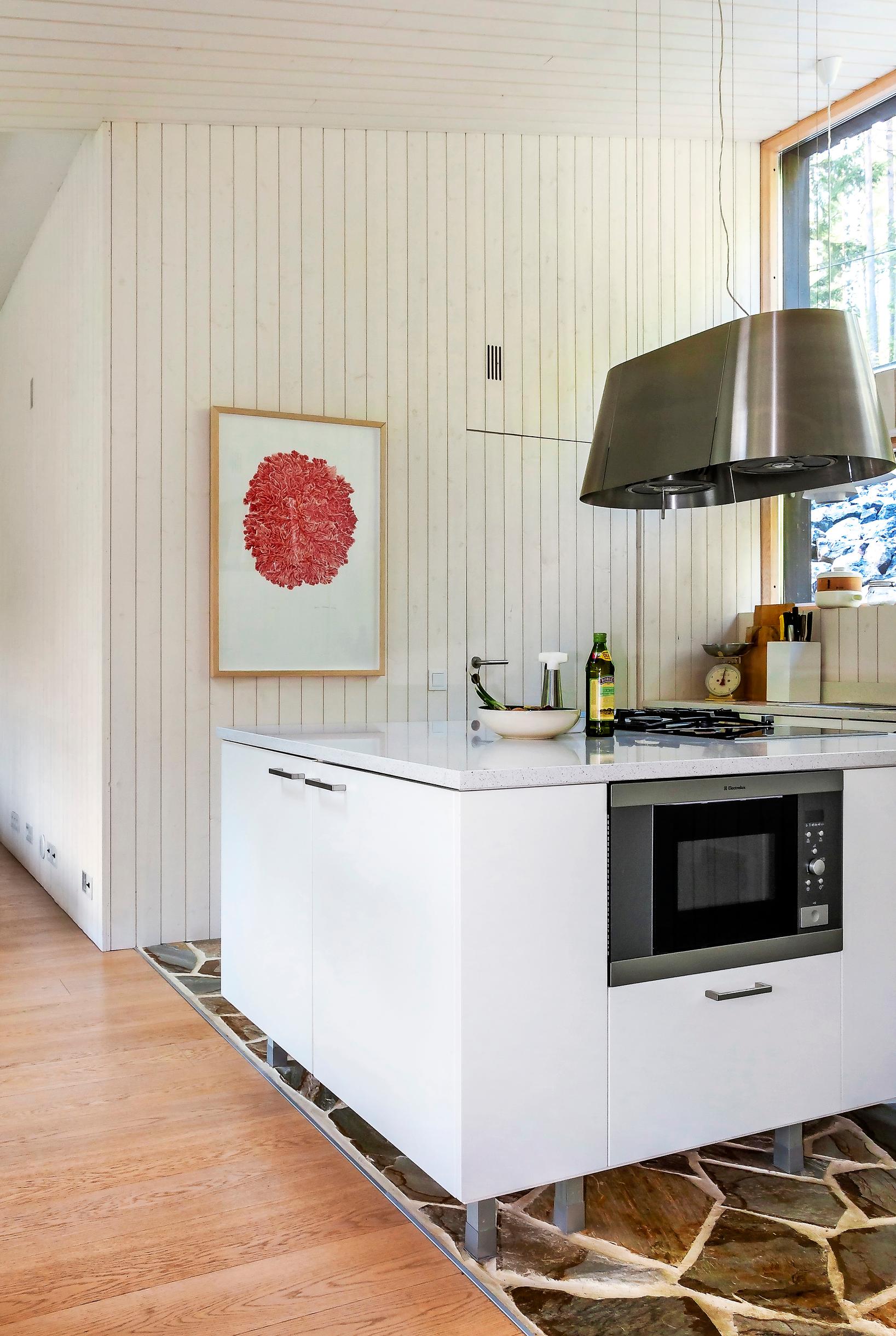 Keittiö on talon sydämessä niin, että siitä on suora näkymä väliseinän jakamaan ruokailutilaan ja olohuoneeseen. Iloisen punainen teos on Sanna Turusen serigrafia. Keittiön saareketta valaisee ja tuulettaa Savon liesituuletin Collection Twin. Loimaan kiven Snow-pöytätasot ovat kvartsikomposiittia. Liesi on Siemensin ja kaapisto Domus-keittiön.