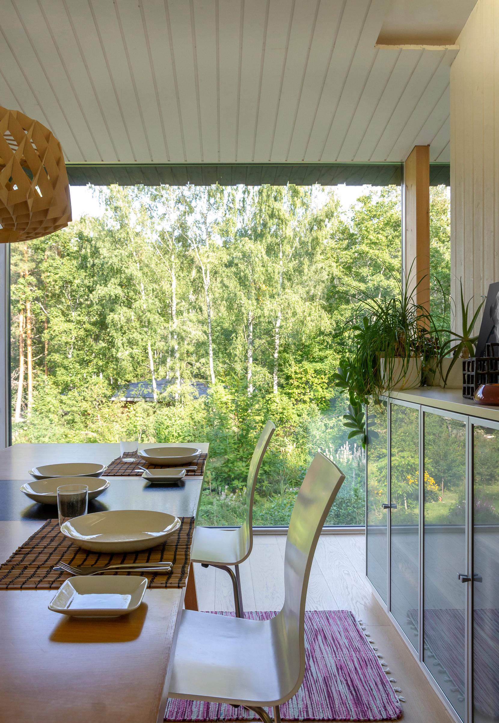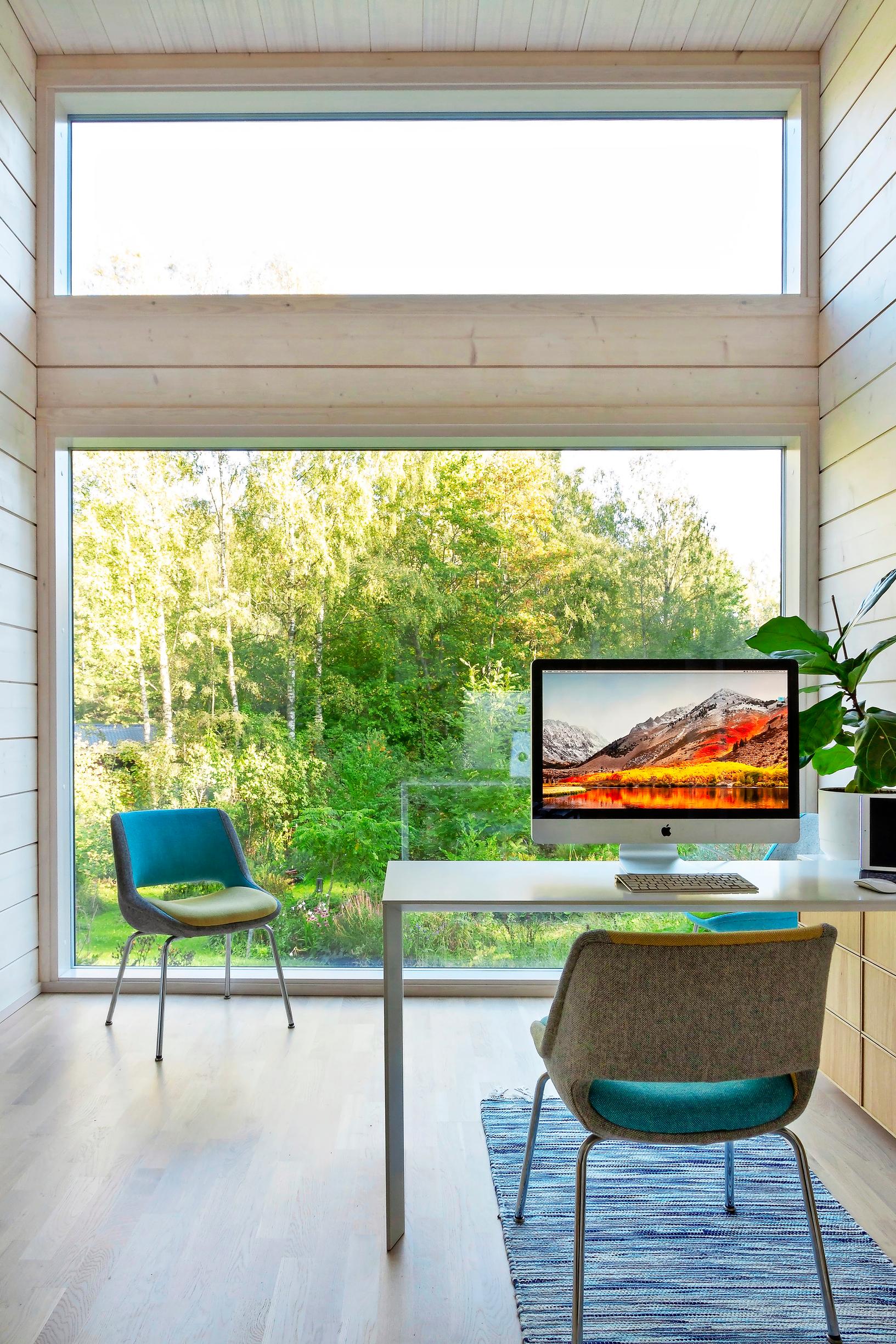 ”Avaimet rauhoittavan tilan luomiseen: luonnonvaloa, vihreitä näkymiä, vaaleaa puupintaa ja tavaramäärä minimiin. Riisuttu selkeys helpottaa lisäksi siivoamista.”