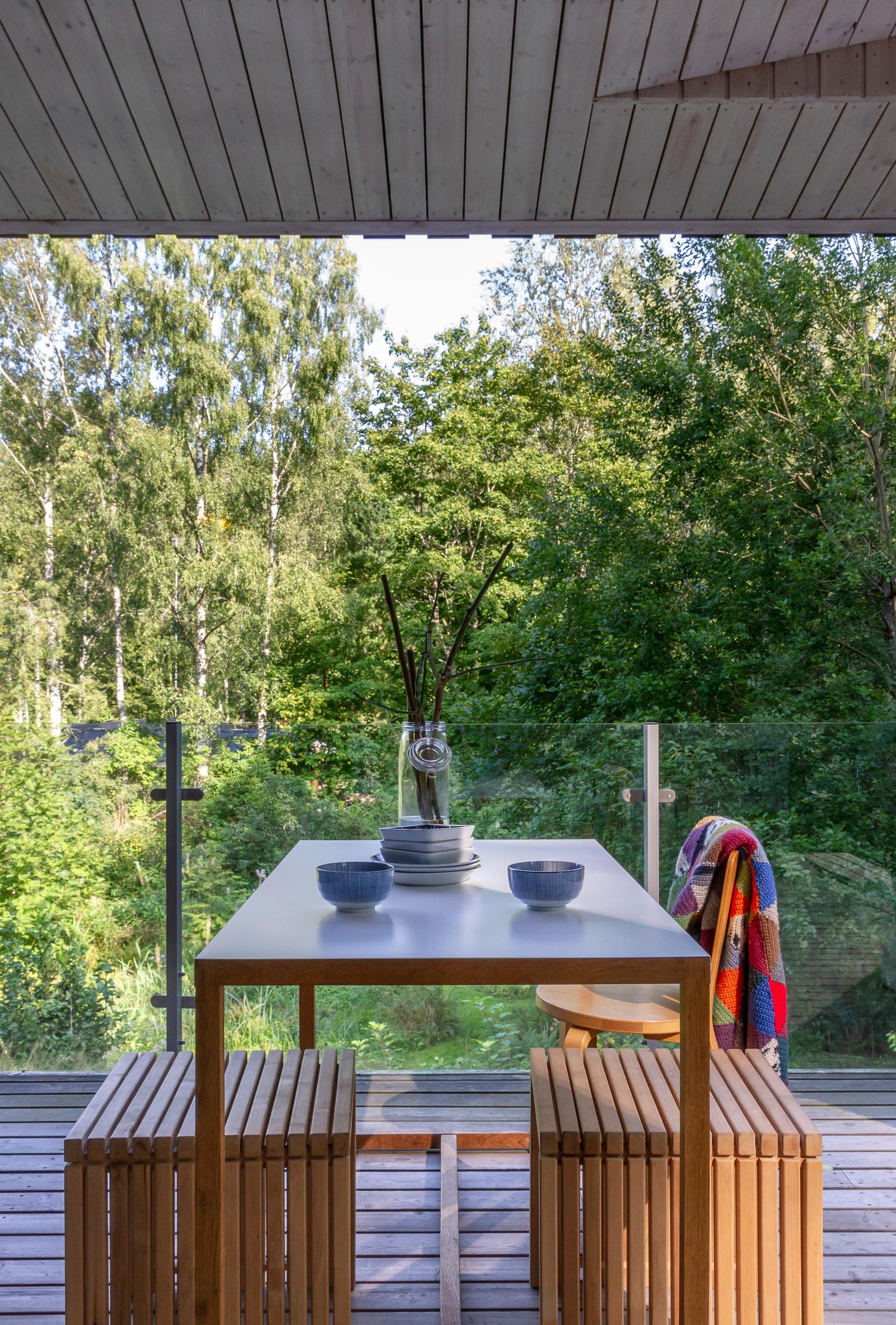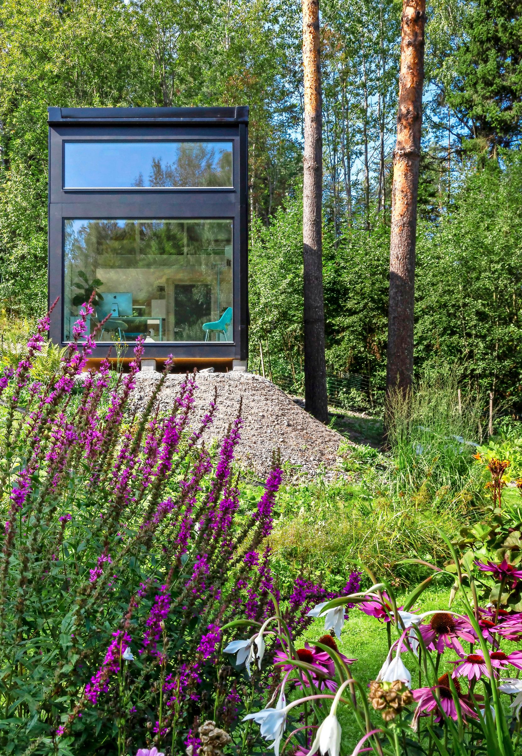 Arkkitehti Heikki Viirin suunnittelema 96-neliöinen päärakennus sai viime syksynä vierelleen tyyliin sopivan hirsimökin, joka toimii sekä vierastalona että kotona yrittäjänä työskentelevän Pekan studiona. Suuret ikkunat tekevät molemmista vehmaan luonnon ympäröimän keitaan, joka inspiroi ja rauhoittaa mieltä. Talossa on huoneiden sijaan pikemmin tiloja.