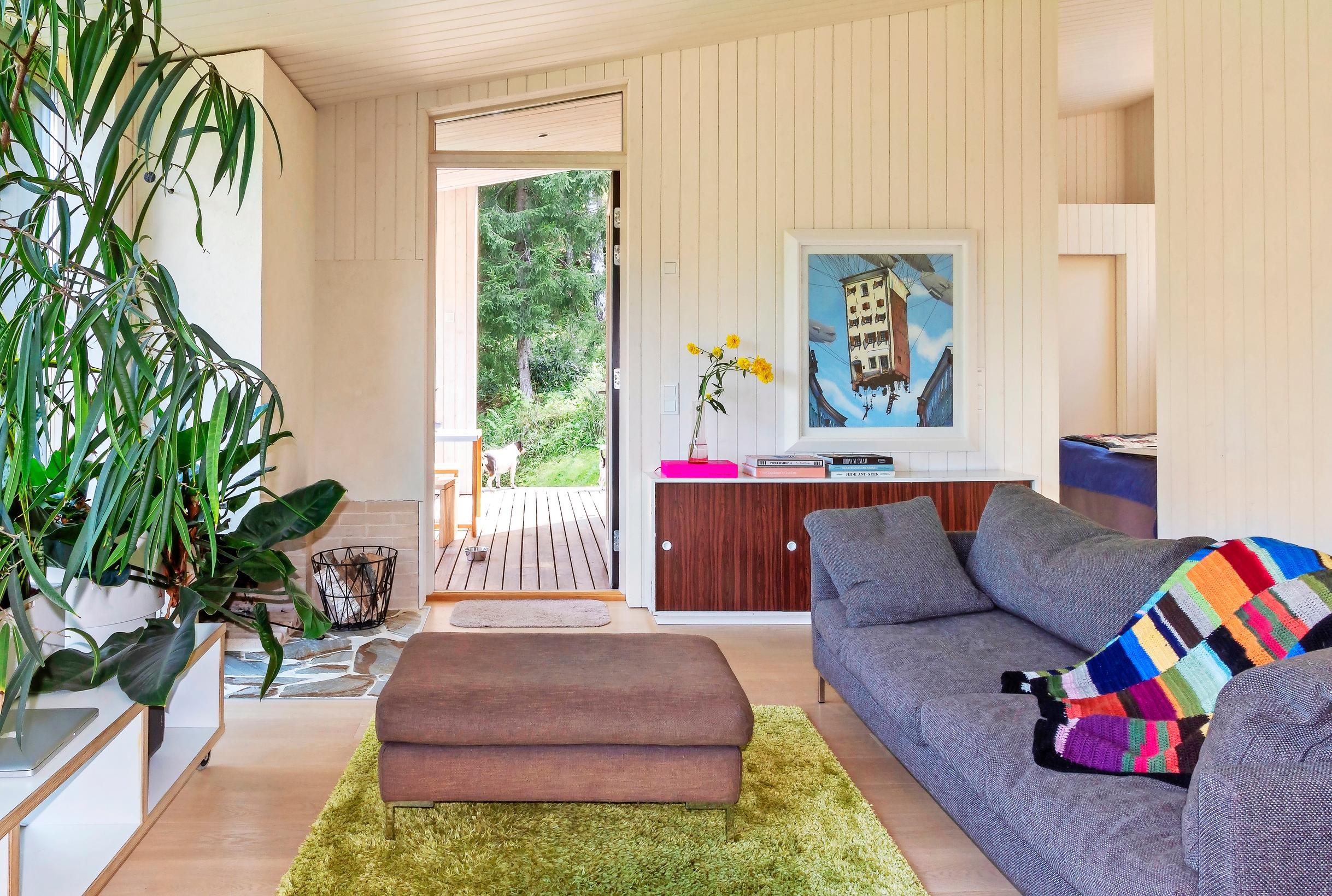 Joka suunnalta virtaava valo saa tilat näyttämään 96 neliötään suuremmilta. Sisustus koostuu harkiten ostetuista nykykalusteista ja vanhoista klassikoista, jotka luovat parille mieluisan, kodikkaan tunnelman. Avaraa olohuonetta hallitsee mukava Insiden sohva raheineen. Vihreä matto löytyi Matto.fi:stä. Alexei Svetlovin teoksen alla oleva liukuovikaapisto Pekan ukin käsialaa.