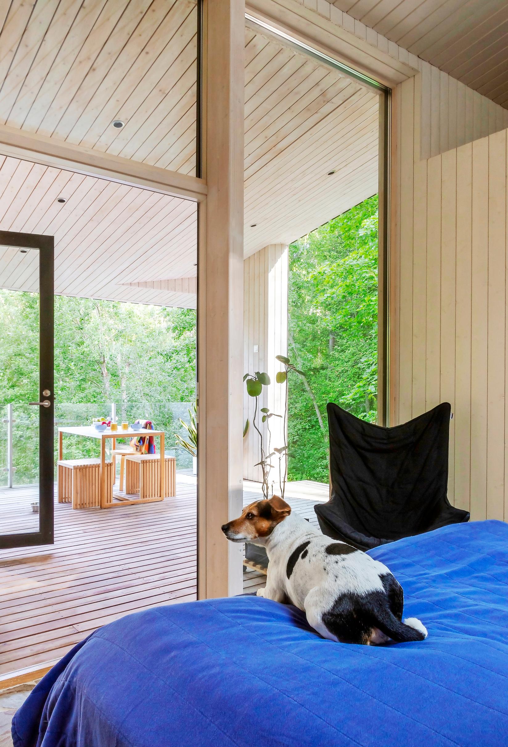 Paavo-koira viihtyy usein Emun tuolissa, joka oli aikoinaan Pekan ensimmäinen designkalustehankinta. Olohuoneen tavoin makuutilasta pääsee terassille. Sen pöytä on Habitatista. Penkit suunnitteli Pekka ja toteutti hienopuuseppä Jüri Sepp.