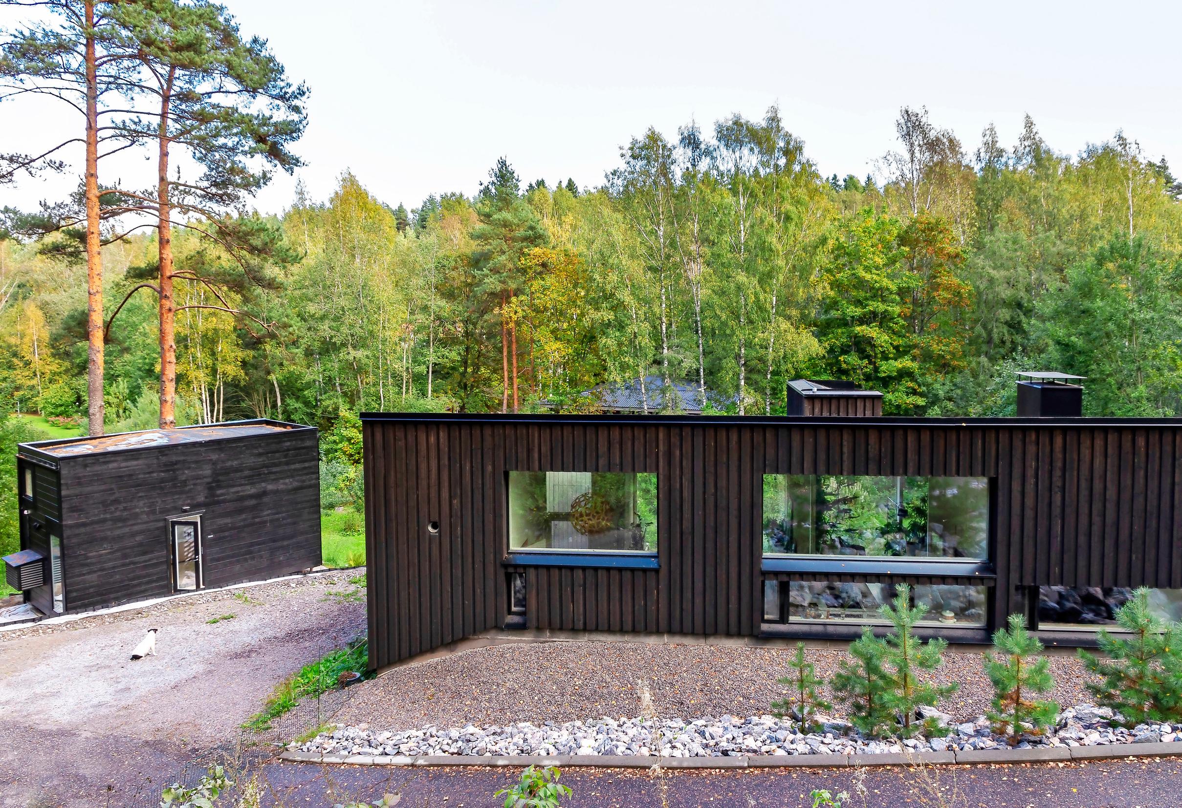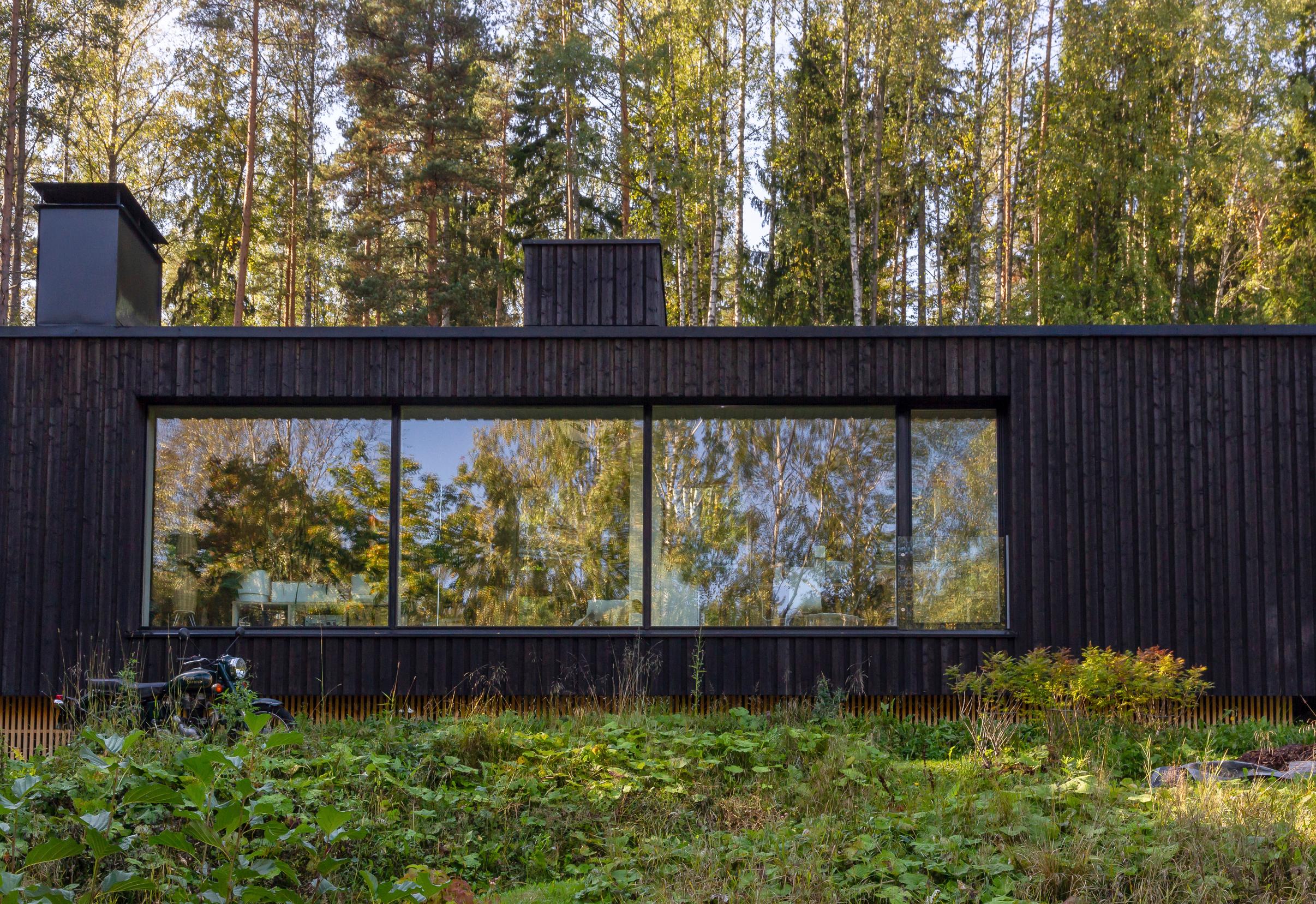 Moderni, tummaksi tervattu puukoti herätti valmistuttuaan huomiota, koska se poikkesi niin paljon alueen taloista. Valoisuudesta pitävä isäntäväki ei ole halunnut peittää ikkunoita verhoilla. Uteliaille kurkistelijoille vain vilkutetaan iloisesti.