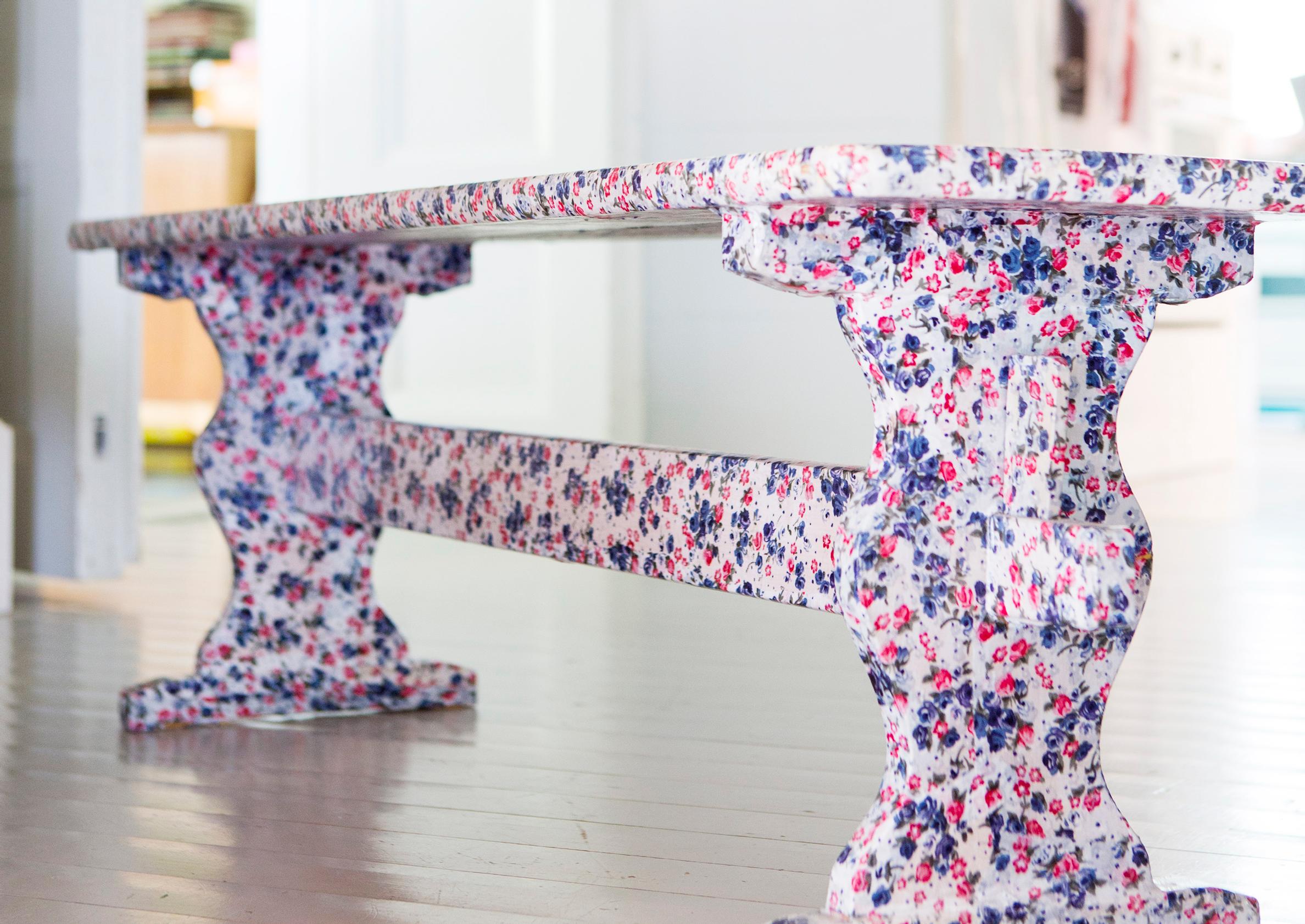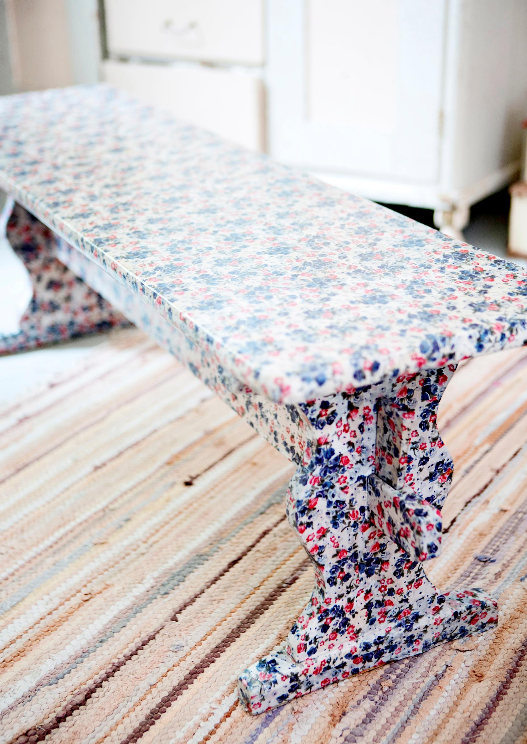 Anna vanhalle penkille uusi elämä ja päällystä se kauniilla kukkakankaalla. Kangas pysyy kiinni penkissä puuliimalla ja kestää käyttöä lakkakerroksen alla.