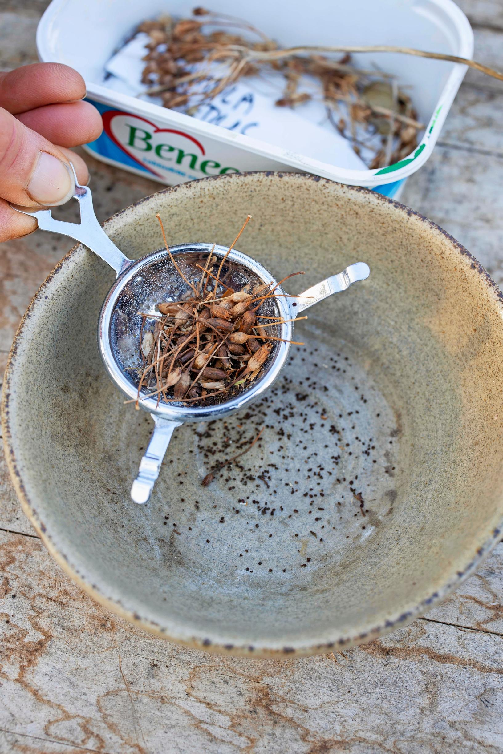- Puhdista siemenet poistamalla varsien ja siemenkotien kappaleet, jotka lisäävät siementen mätänemisriskiä kylvövaiheessa. Ropistele perennojen siemenkotia astian yläpuolella tai siivilässä. Voit myös talloa varsia kevyesti sanomalehden päällä.