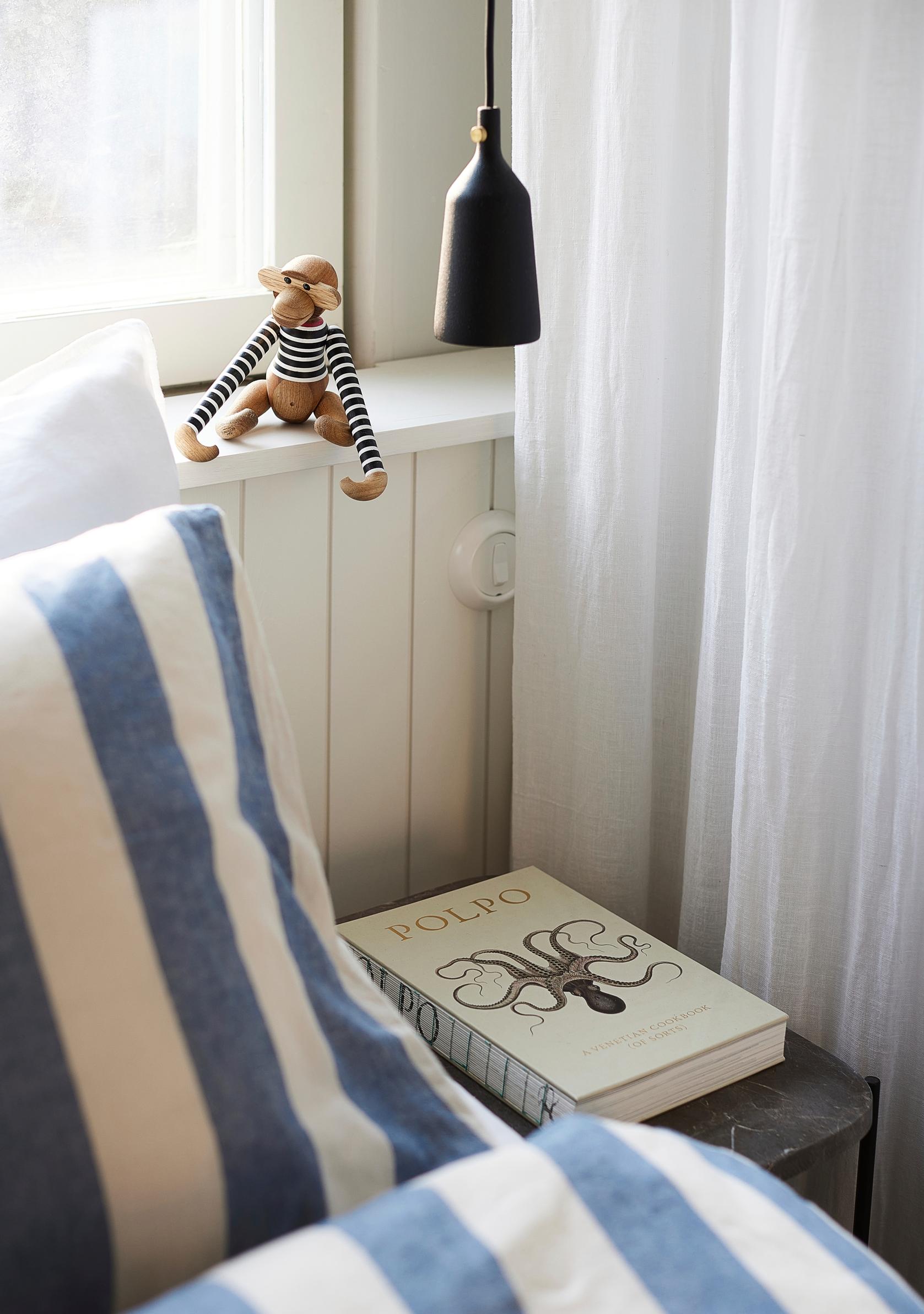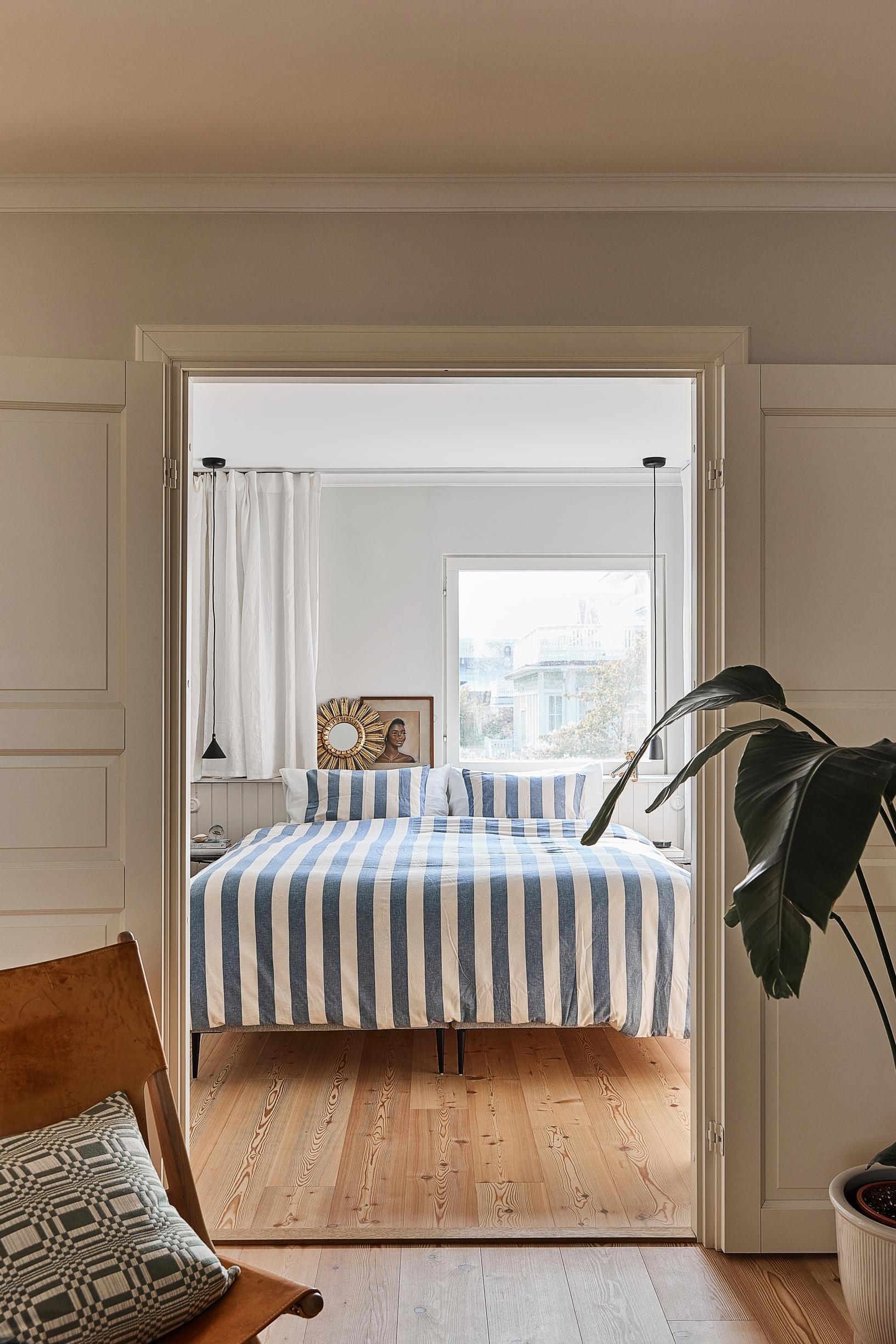 Makuuhuoneen raidallinen petaus vie ajatukset merelle. Raikasta lomahuvilahenkeä luovat myös hennot, valkeat verhot, hiekan sävyt ja lämpimät puupinnat.