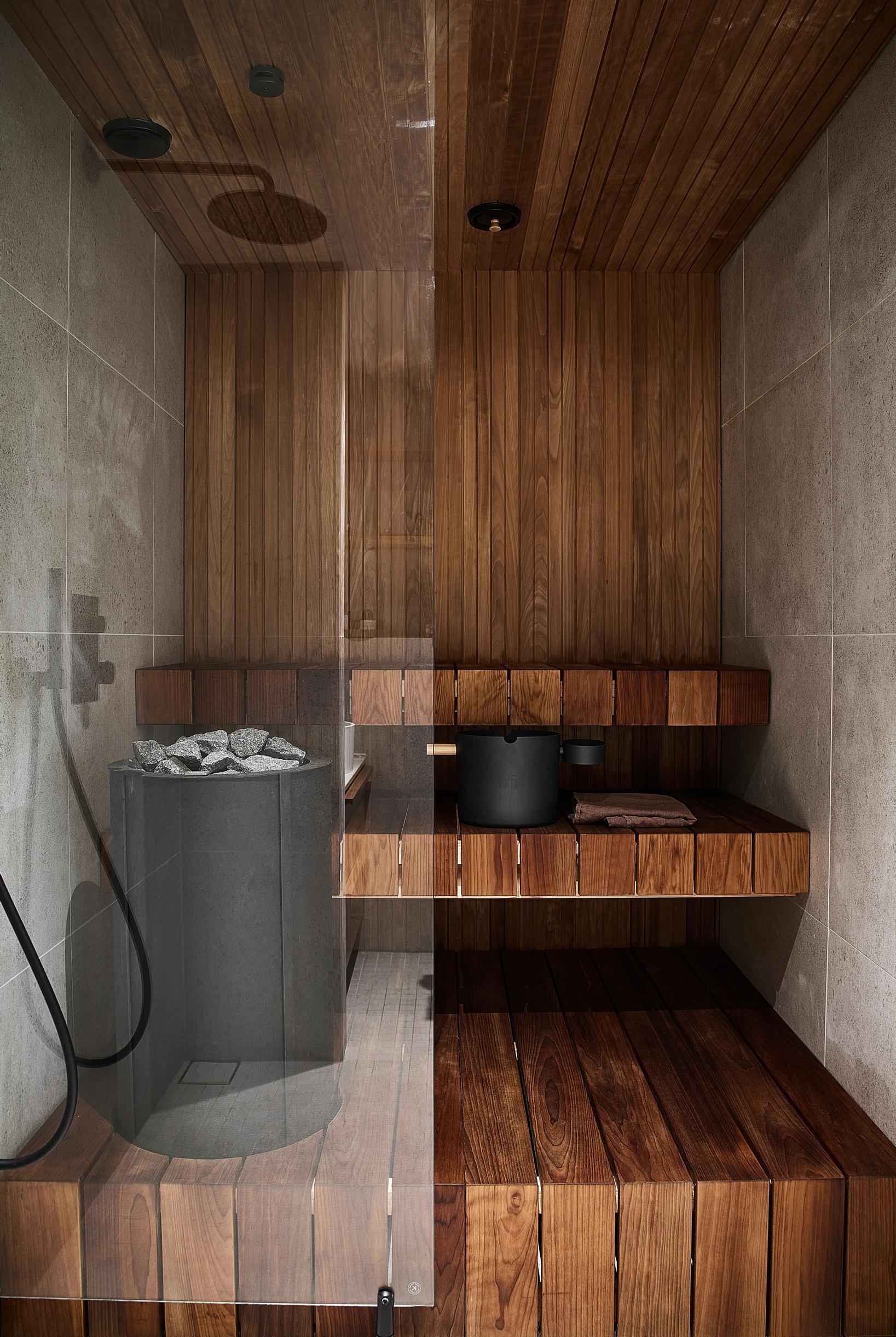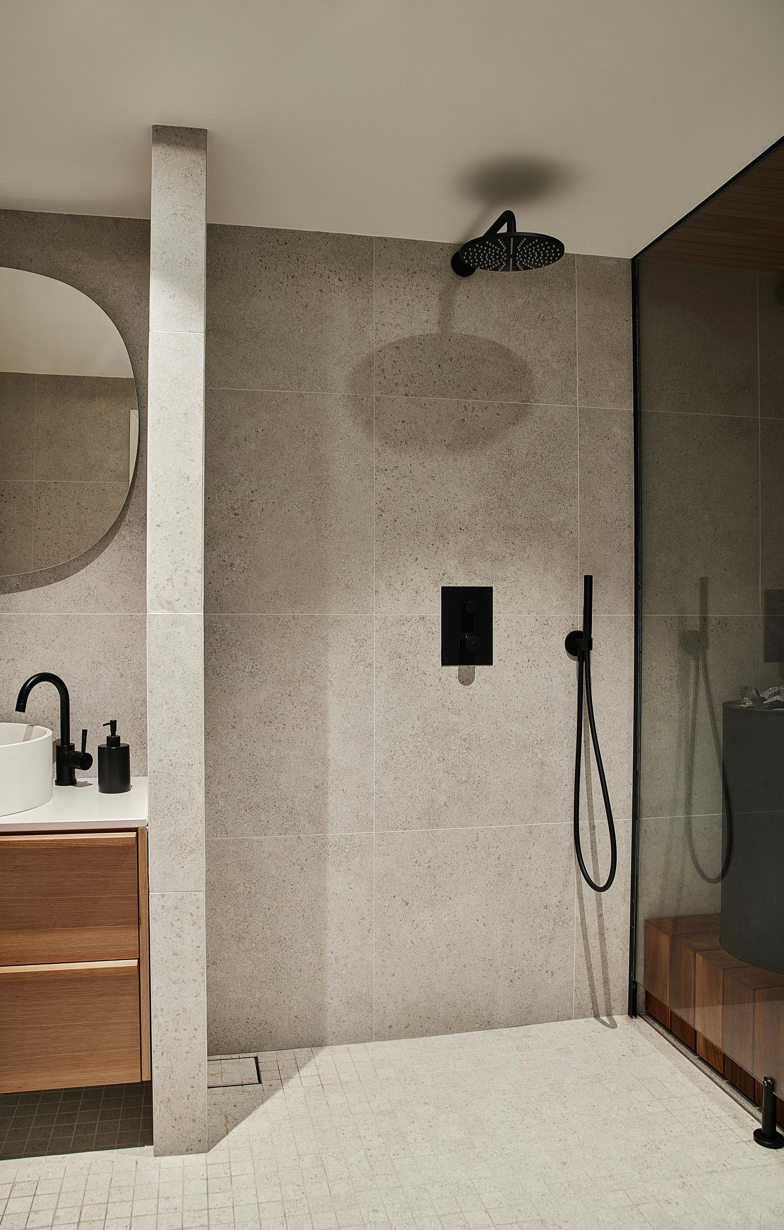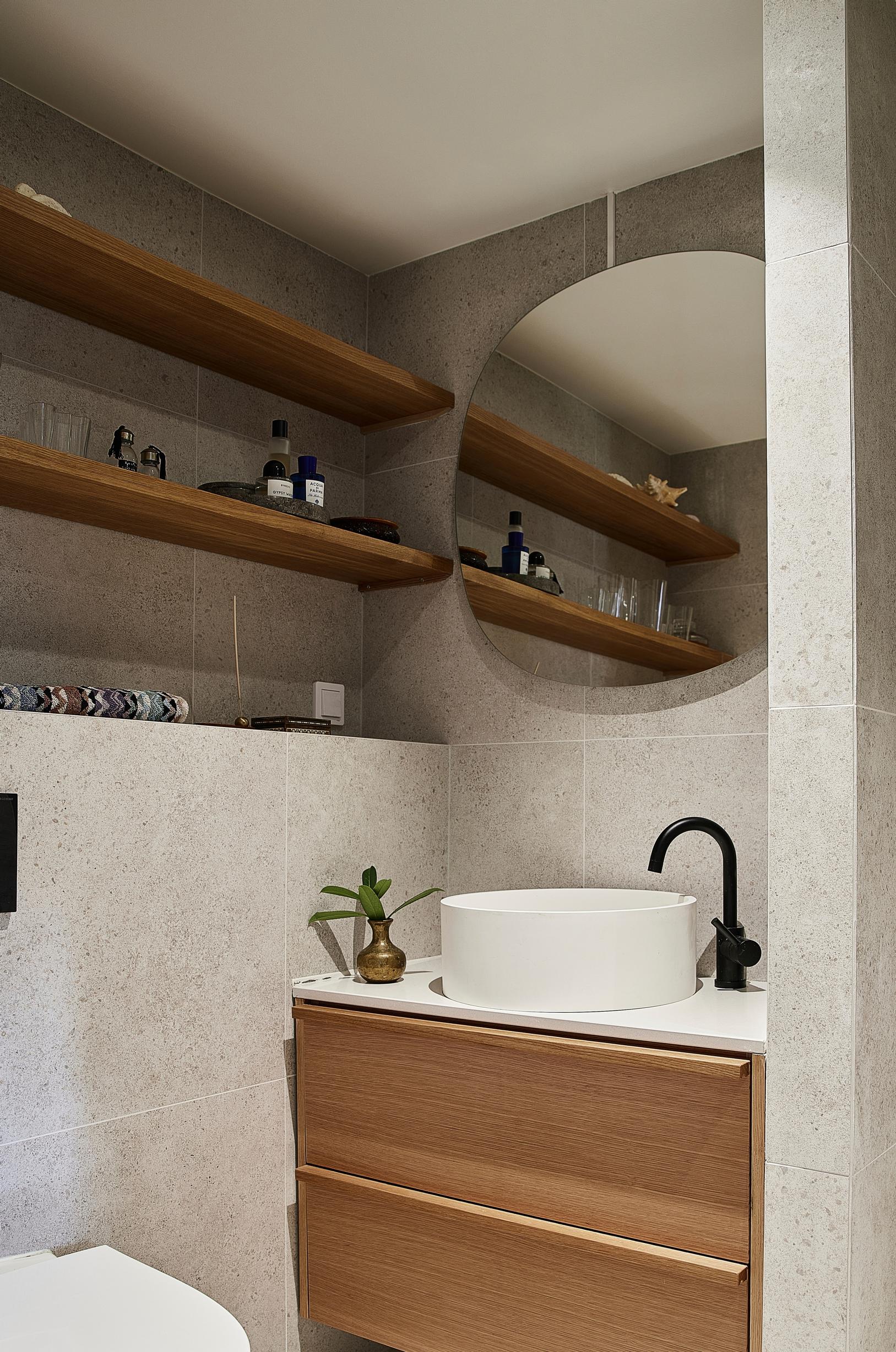 Kylpyhuoneen remontissa tavoite oli ajaton skandinaavinen ilme. Se syntyi puupinnoilla, linjakkailla muodoilla ja neutraaleilla suurlaatoilla.