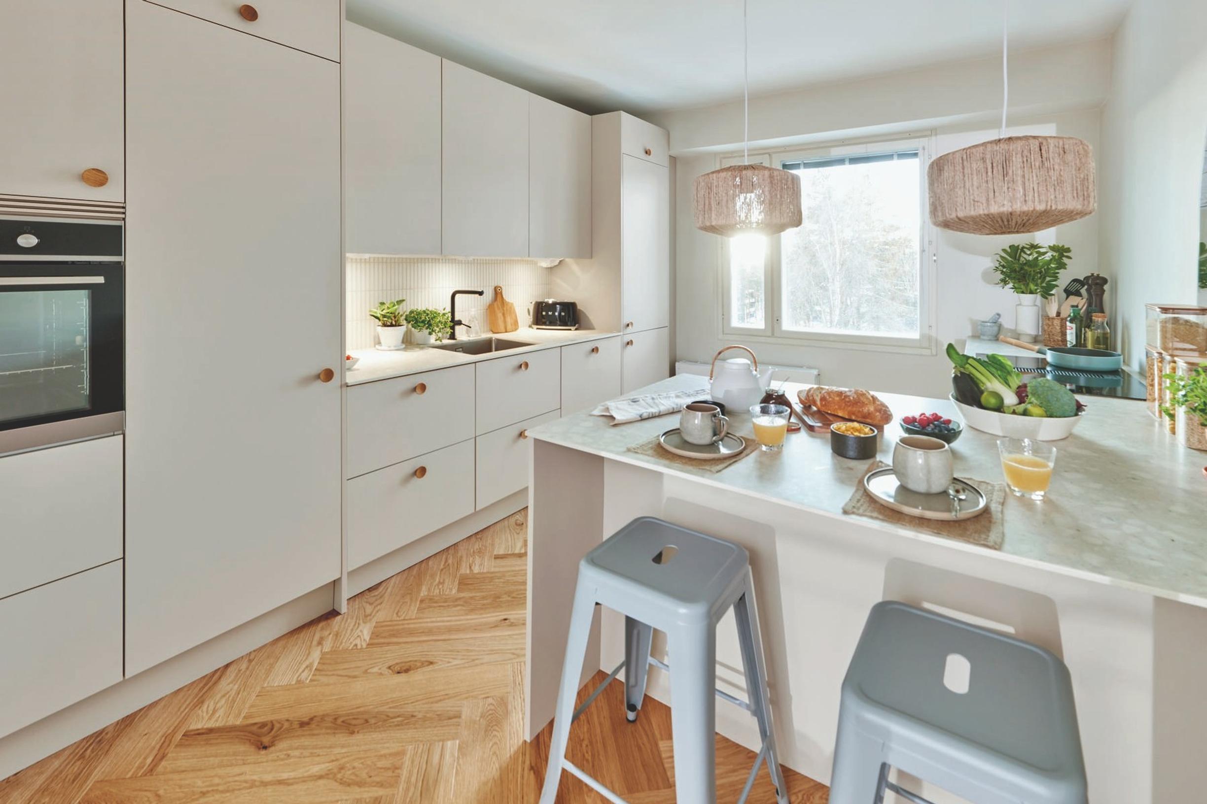 Pienen keittiön upea muodonmuutos – lopputuloksena neliöitään avarampi kodin sydän