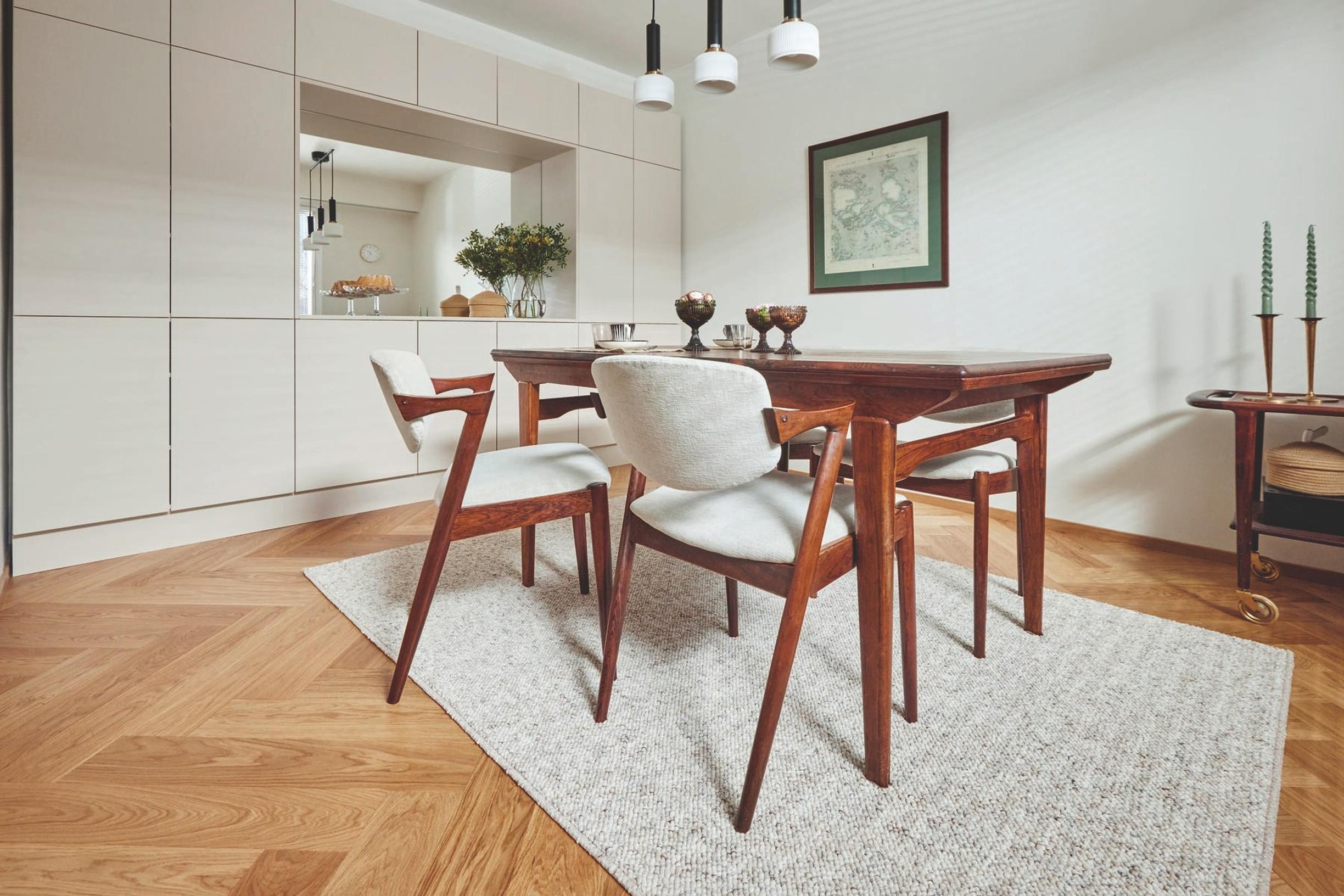 Johanna perheineen löysi unelmiensa kodin vuonna 1965 rakennetusta kerrostalosta, jonka selkeä arkkitehtuuri teki heihin vaikutuksen. Perhe halusi säilyttää selkeän linjan myös uuden kotinsa sisustuksessa ja remontoida kolmiosta viihtyisämmän. Remontin yhteydessä myös epäkäytännöllinen keittiö uusittiin.