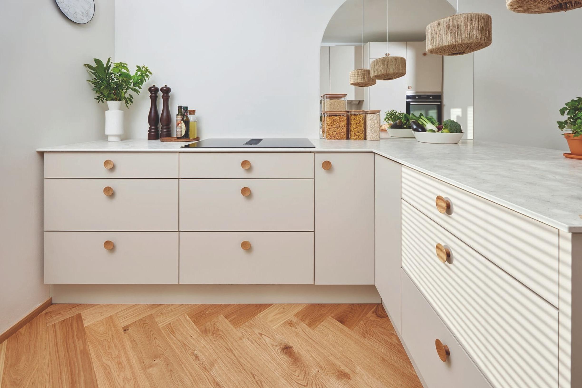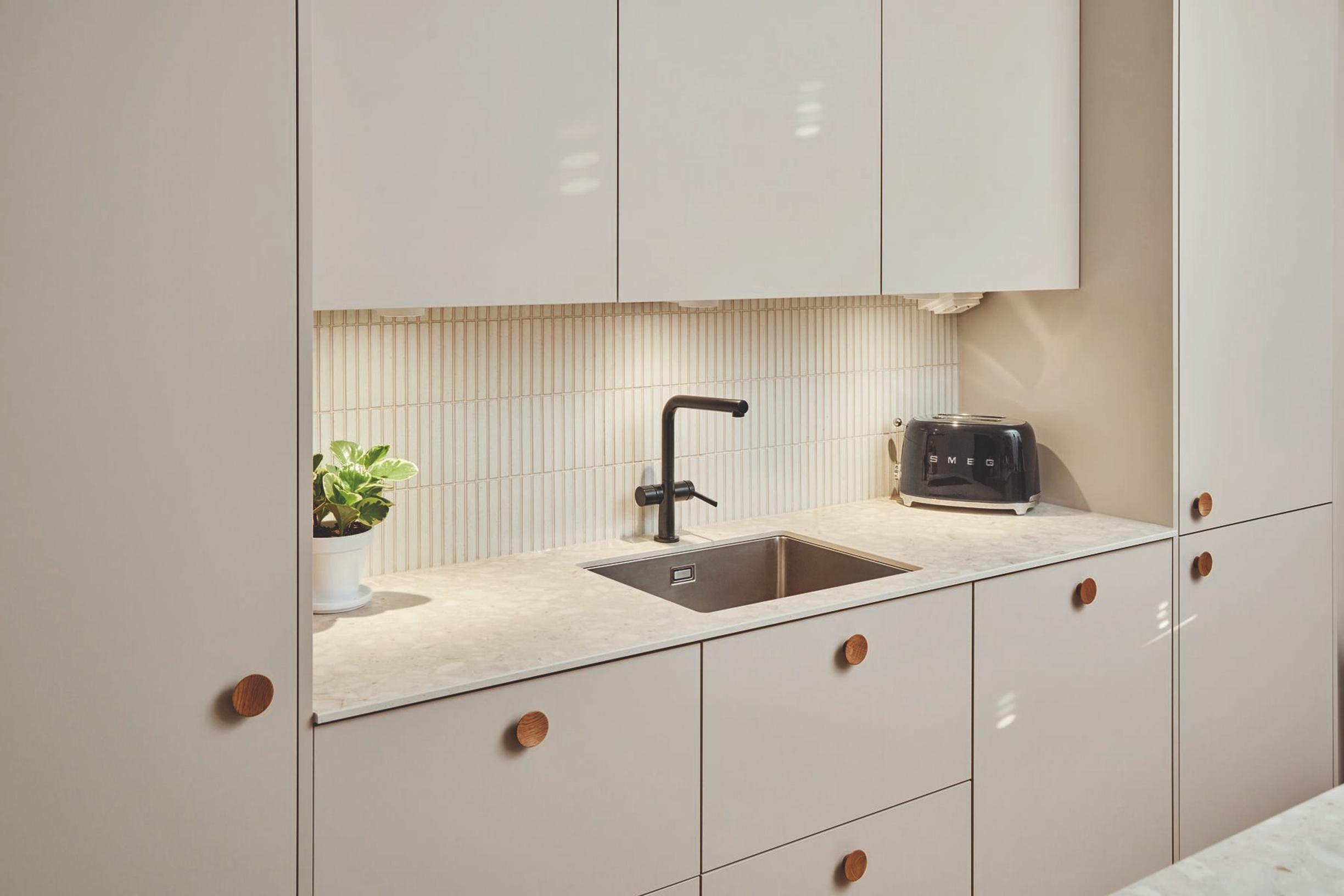 Uusi keittiö rakentui K-Raudan Cello-keittiöiden uudistunutta mallistoa hyödyntäen. Johanna suunnitteli sen itse, sillä haaveissa oli ollut jo pitkään pehmeän murretun sävyinen keittiö. K-Raudan keittiösuunnittelija hioi ja muokkasi yksityiskohdat paikalleen Johannan suunnitelmien mukaan.