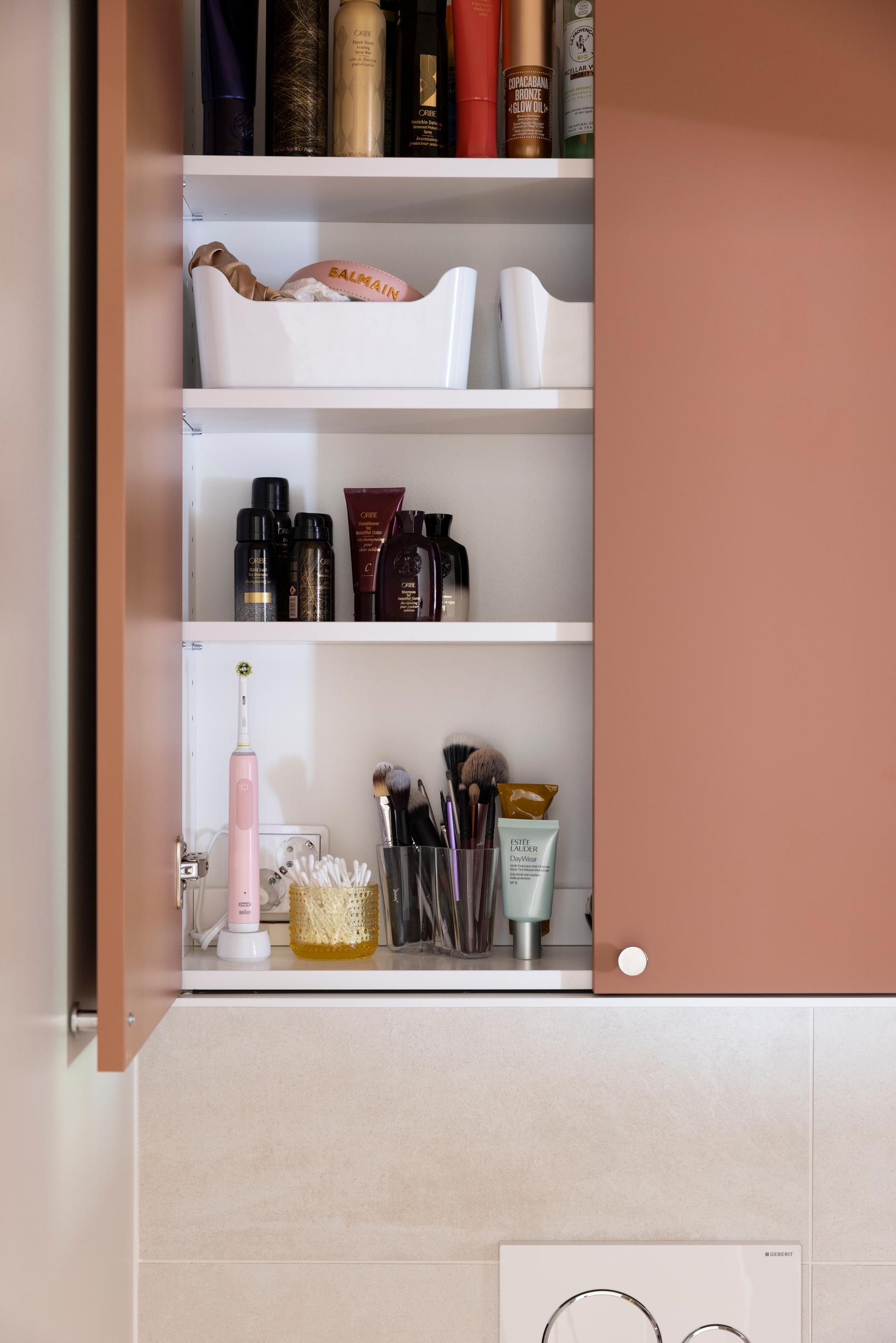 Kampaajana työskentelevällä Amanda Kanervalla on kotonakin paljon kosmetiikkaa. Putkiremontin yhteydessä uusittuun vessaan hän toivoi siksi paljon lisää säilytystilaa.