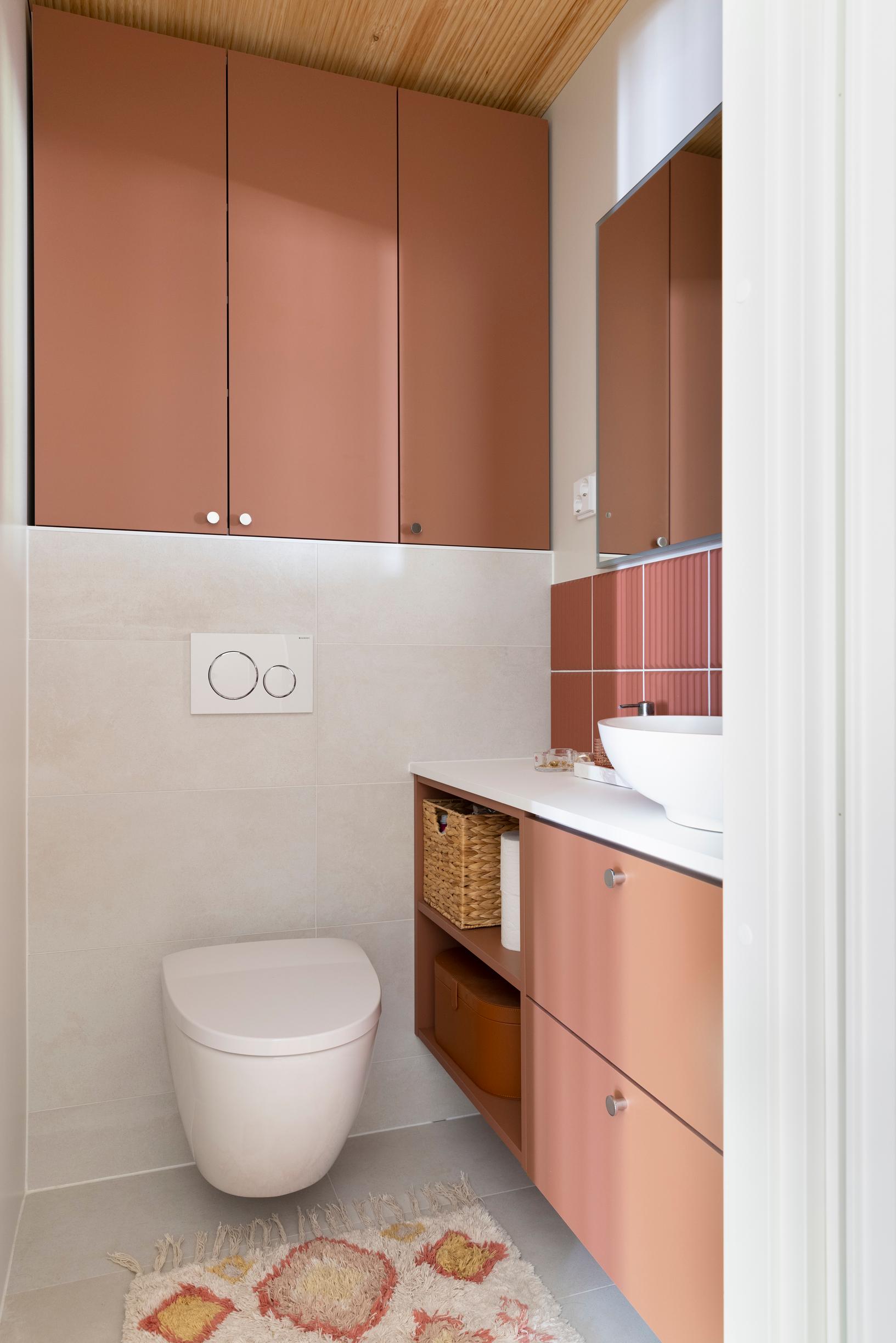 Hän itse olisi voinut valita vessaan puhdasta pinkkiä, mutta yhdessä puolison kanssa he päätyivät poltettuun roosaan.