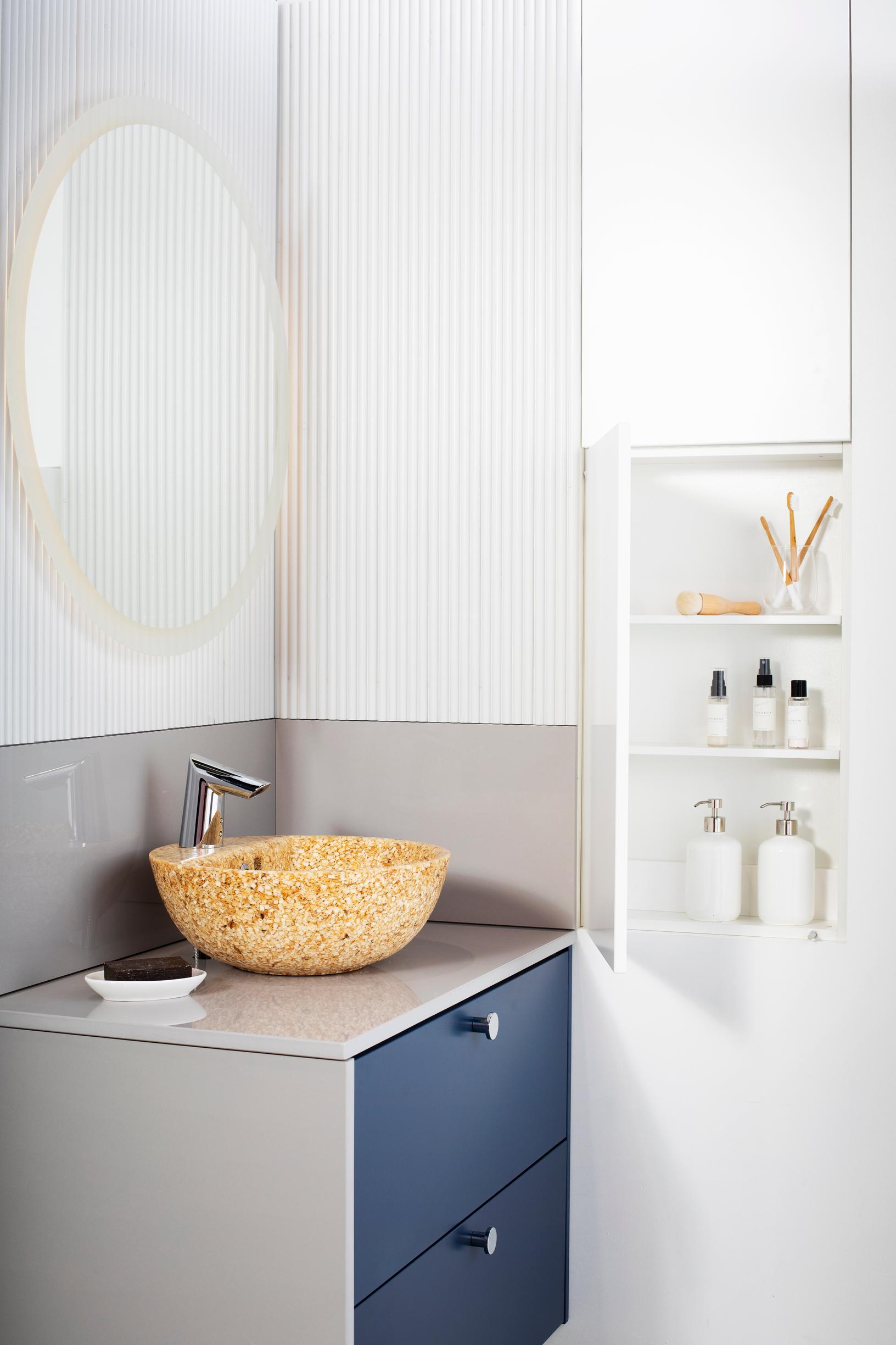 Kylpyhuoneessa seinään upotetut hyllykaapit tuovat täysin huomaamatonta lisätilaa. Allaskaapin katseenvangitsija on kotimainen, nature-sävyn Woodio Soft 40 -allas, joka on valmistettu puukomposiitista ja sidosaineista. Pyöreä peili keventää kokonaisuutta.
