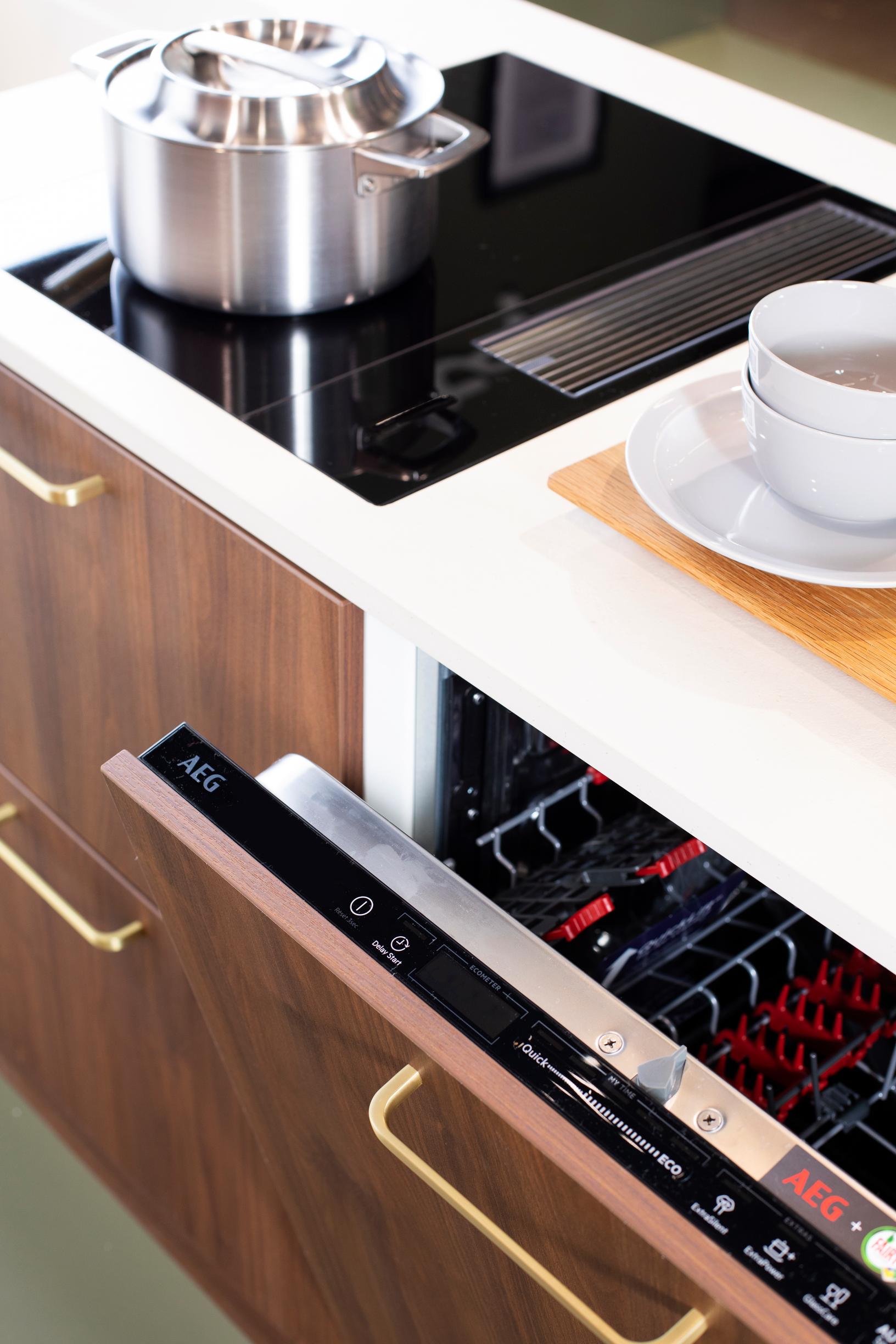 Messuilla nähtävä keittiö on kompakti kokonaisuus, jossa säilytystilaa on saatu sijoittamalla kaappeja ylöspäin. Pieni saareke kätkee sisälleen monia toimintoja.