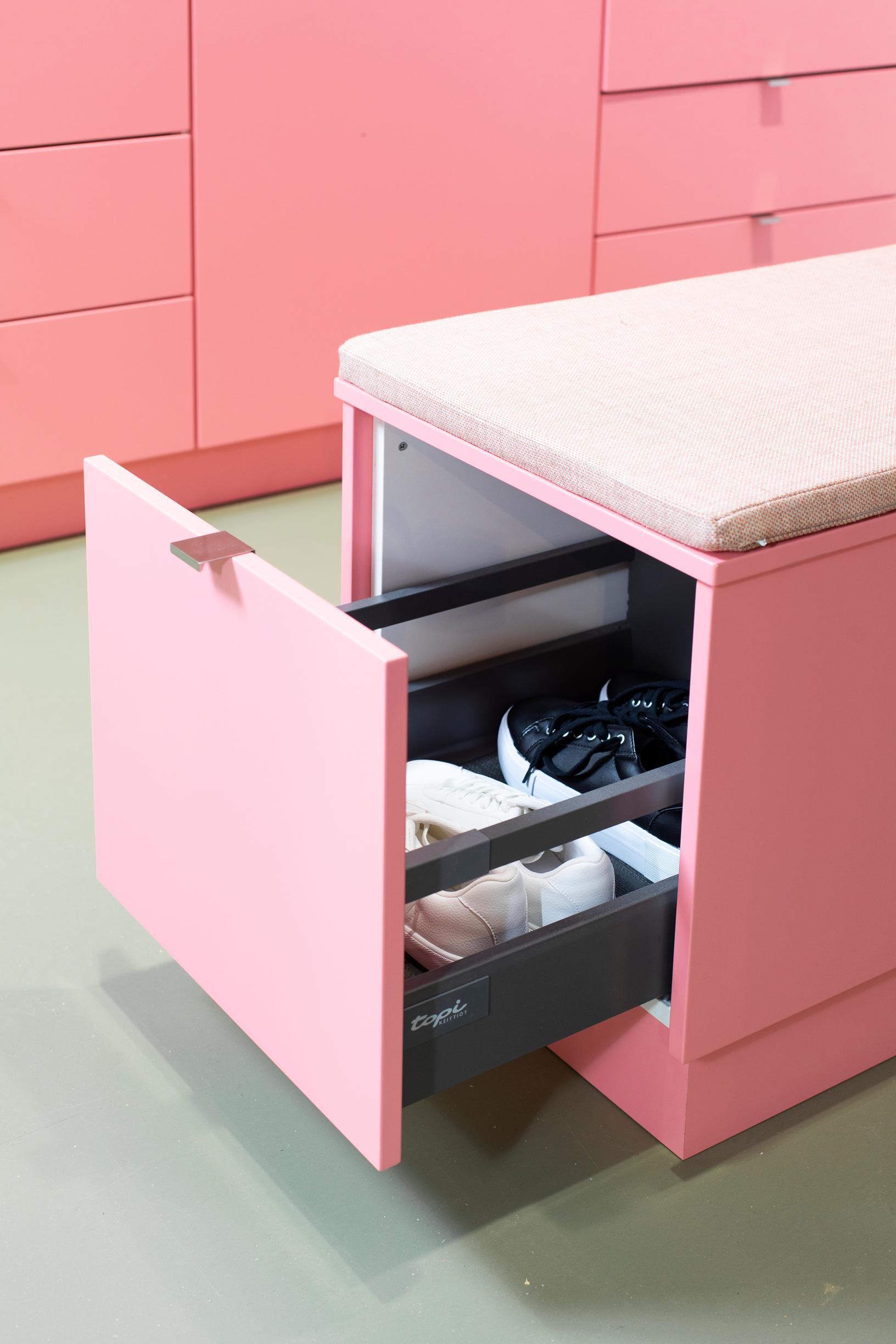 Kodin vaatesäilytys voi olla myös vahva sisustuselementti: uusi Kosketus-ovimallin sävy on rohkea ja hehkeä bebe. Komeroihin on kätketty erilaisia sisustarvikkeita, kuten uusi housuteline. Kaappien sisällä on myös valaistus. Ovien Lungo-vedin on ruostumatonta terästä.