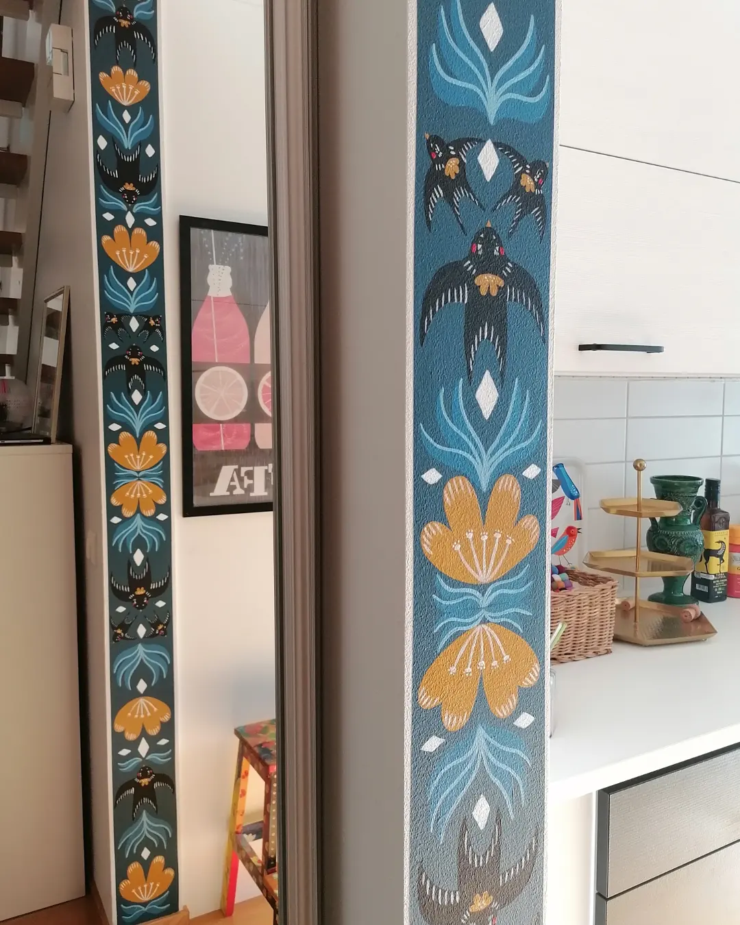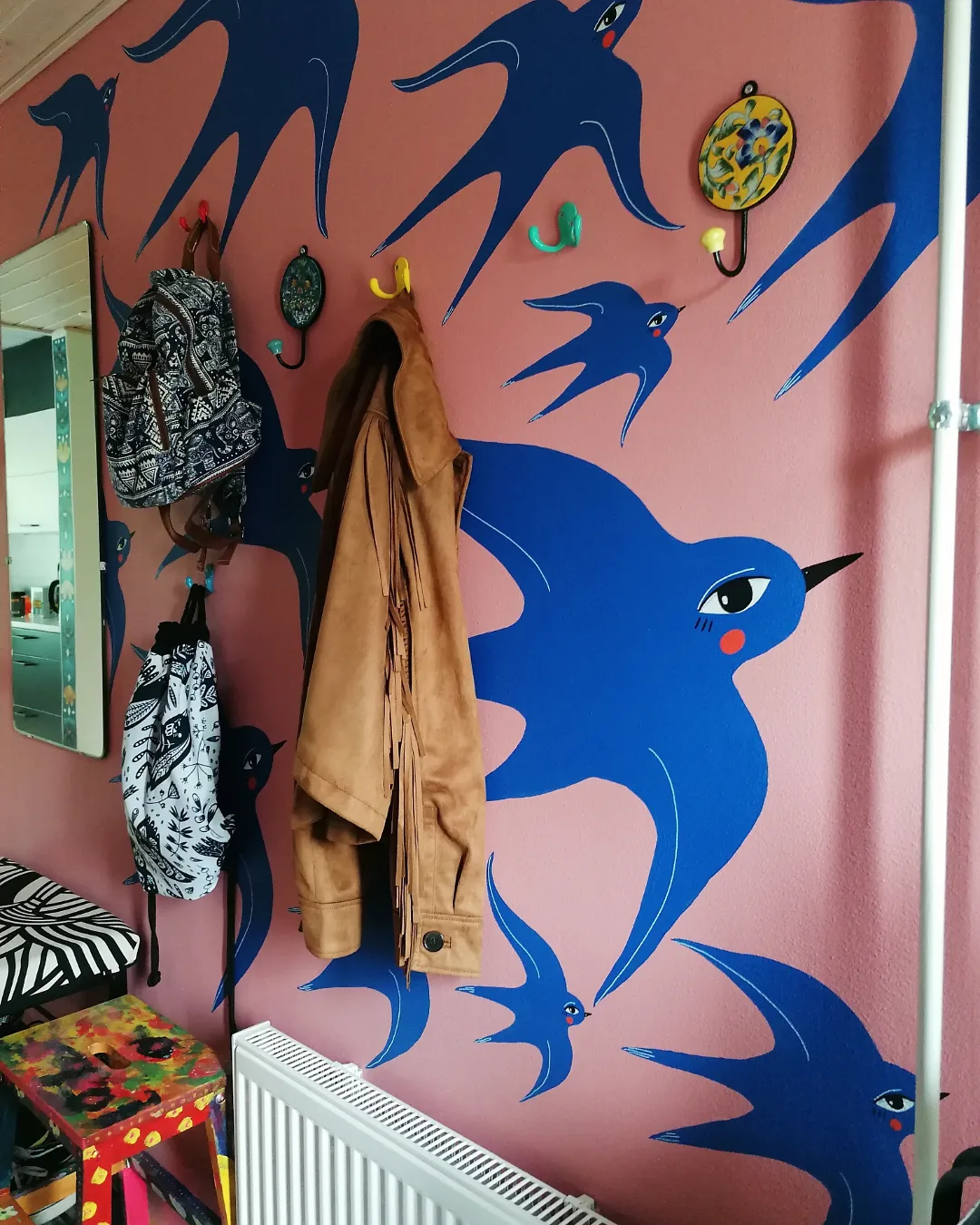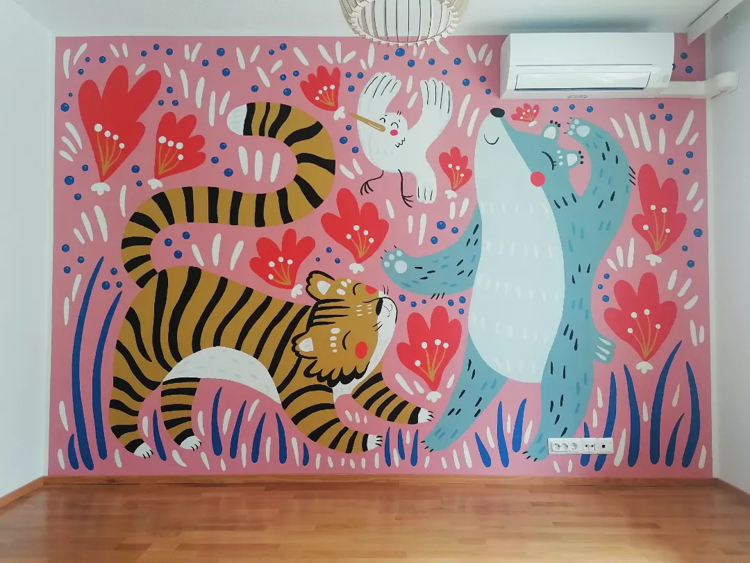Uuden kodin työhuoneeseen maalasin tiikerin, linnun ja karhun tanssimaan. Valitsin ensin värit ja kuva syntyi sitten hyvin spontaanisti. Oli ihanaa saada sinne koko seinän kokoinen kuva. Työhuoneen ylijäämämaaleilla maalasin eteisen seinän ensin vaaleanpunaiseksi ja koristelin sen sitten sinisillä linnuilla.