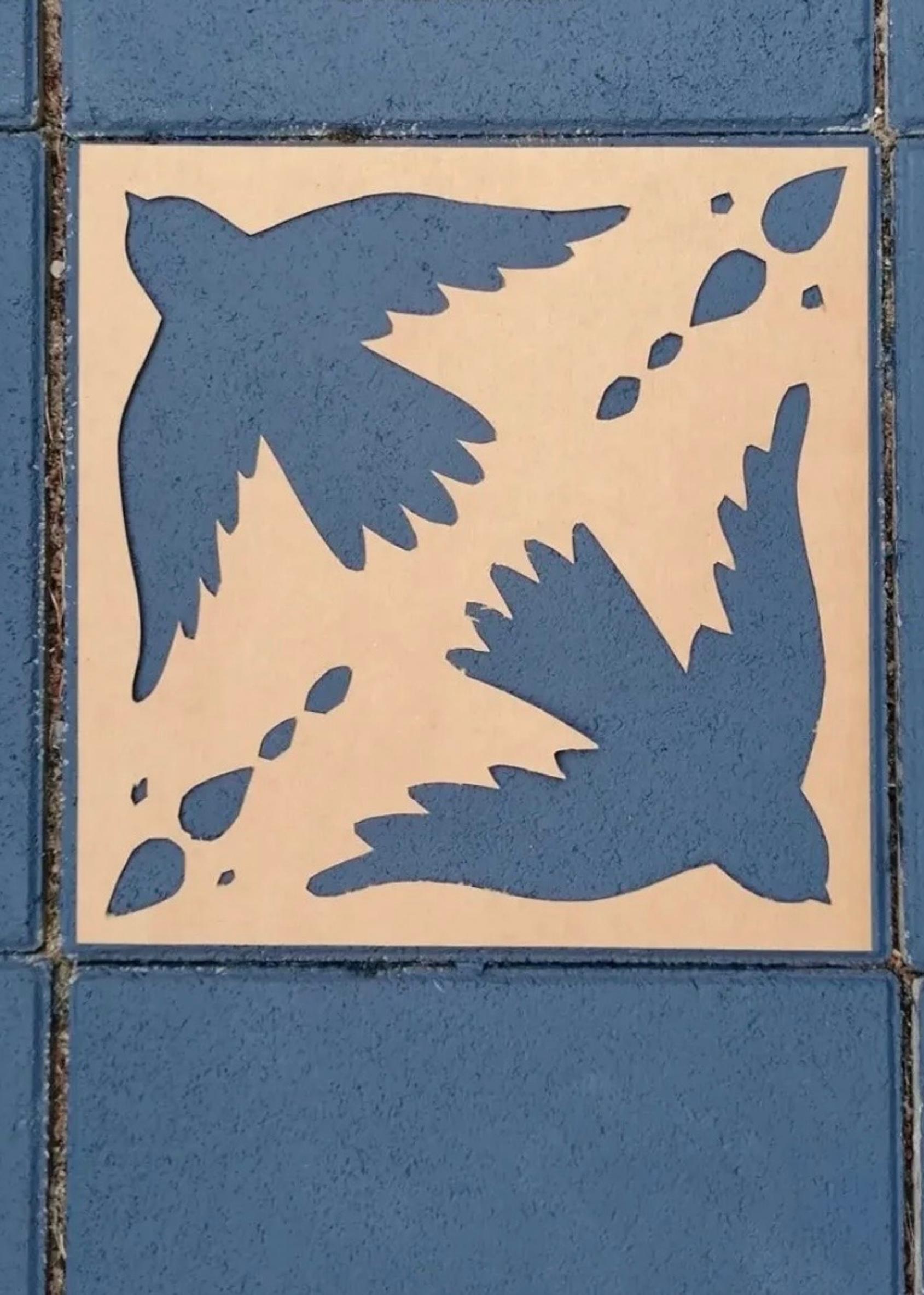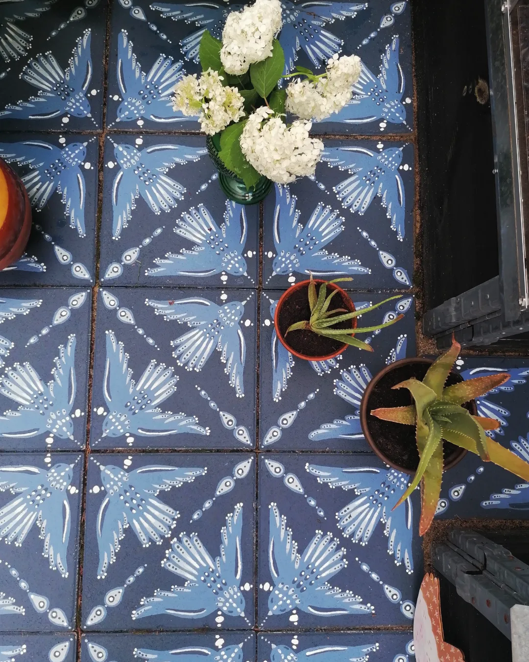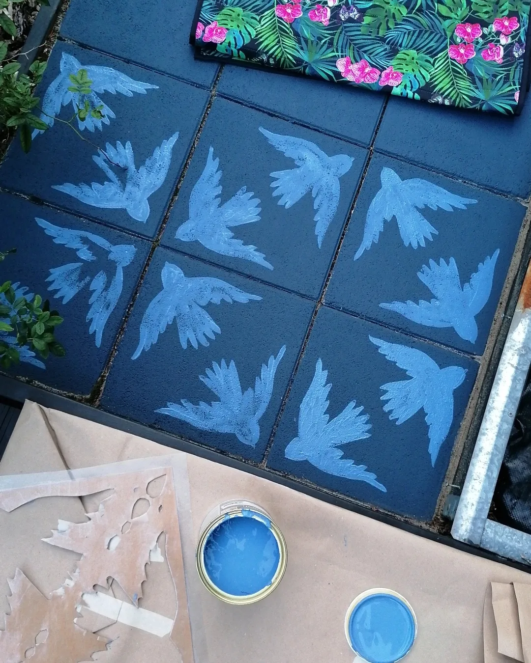 Etupihalla laattoja oli yksi ja puoli riviä. Siihen en halunnut säännöllistä kuviota, joten tein hahmotelman liidulla ja piirsin lintuja ja kukkia yli laattojen rajojen.