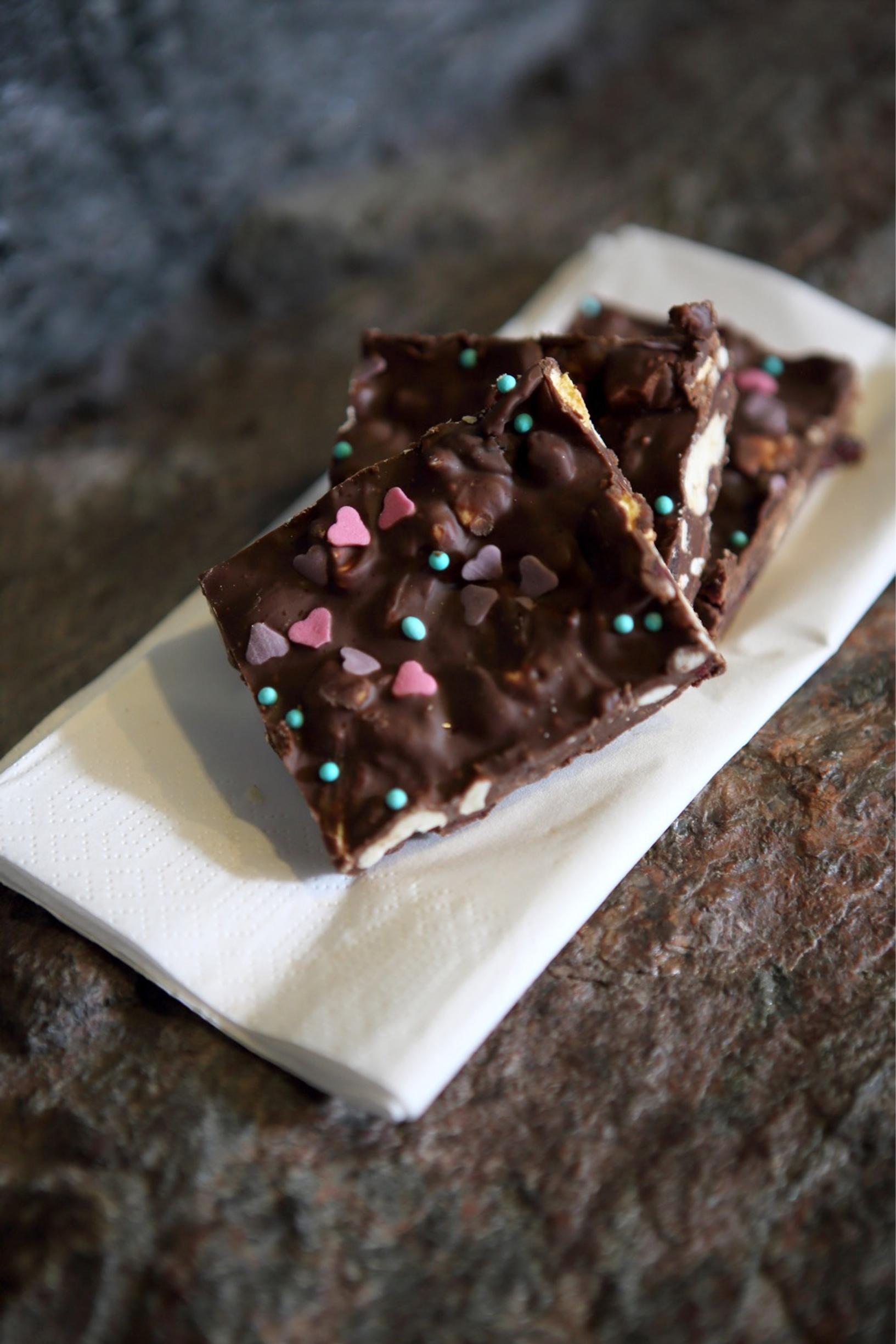 Jälkkärinä maistuu lohkare suklaista neljän raaka-aineen rocky roadia. Jos osaat sulattaa suklaan, osaat tehdä myös tämän!