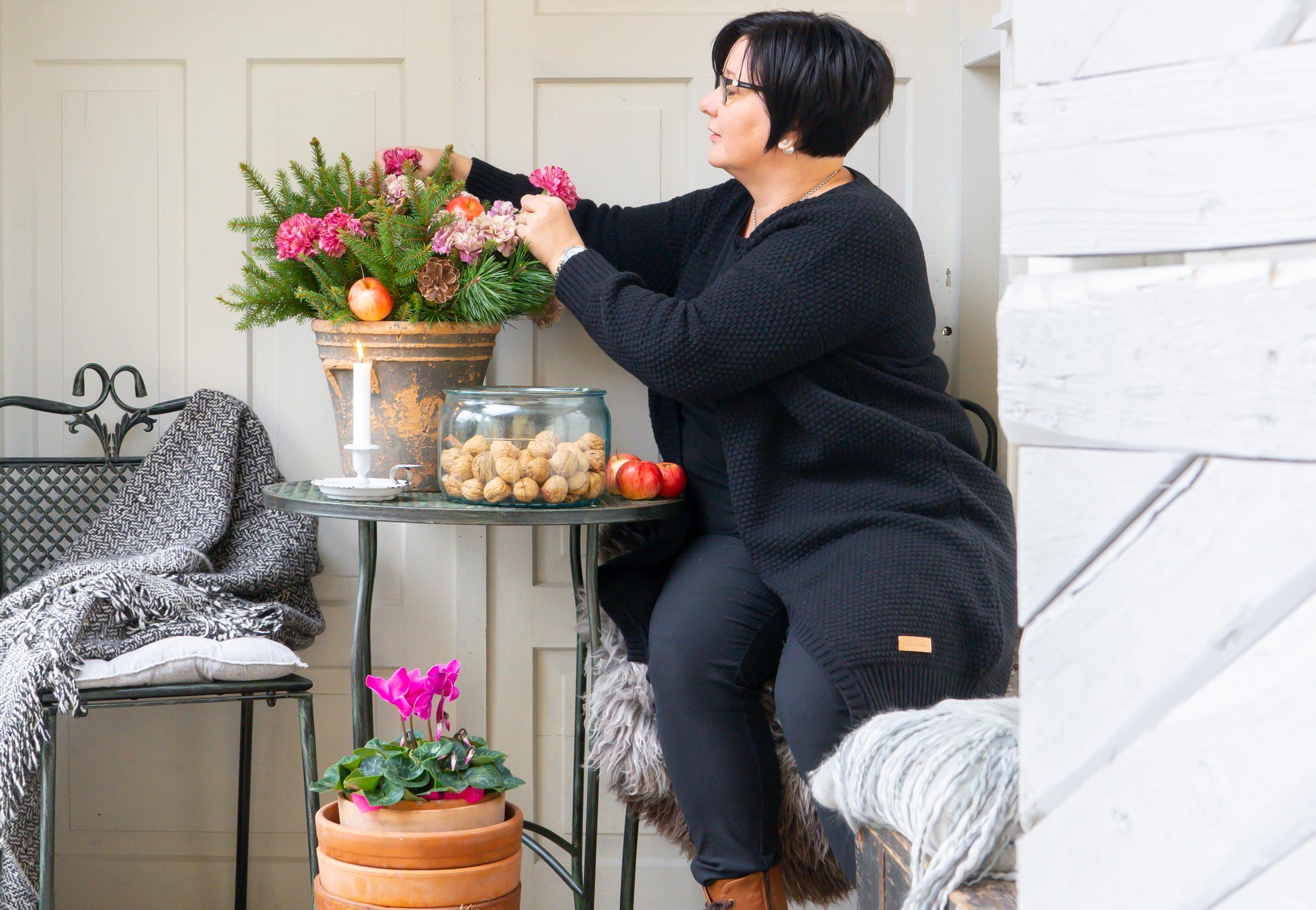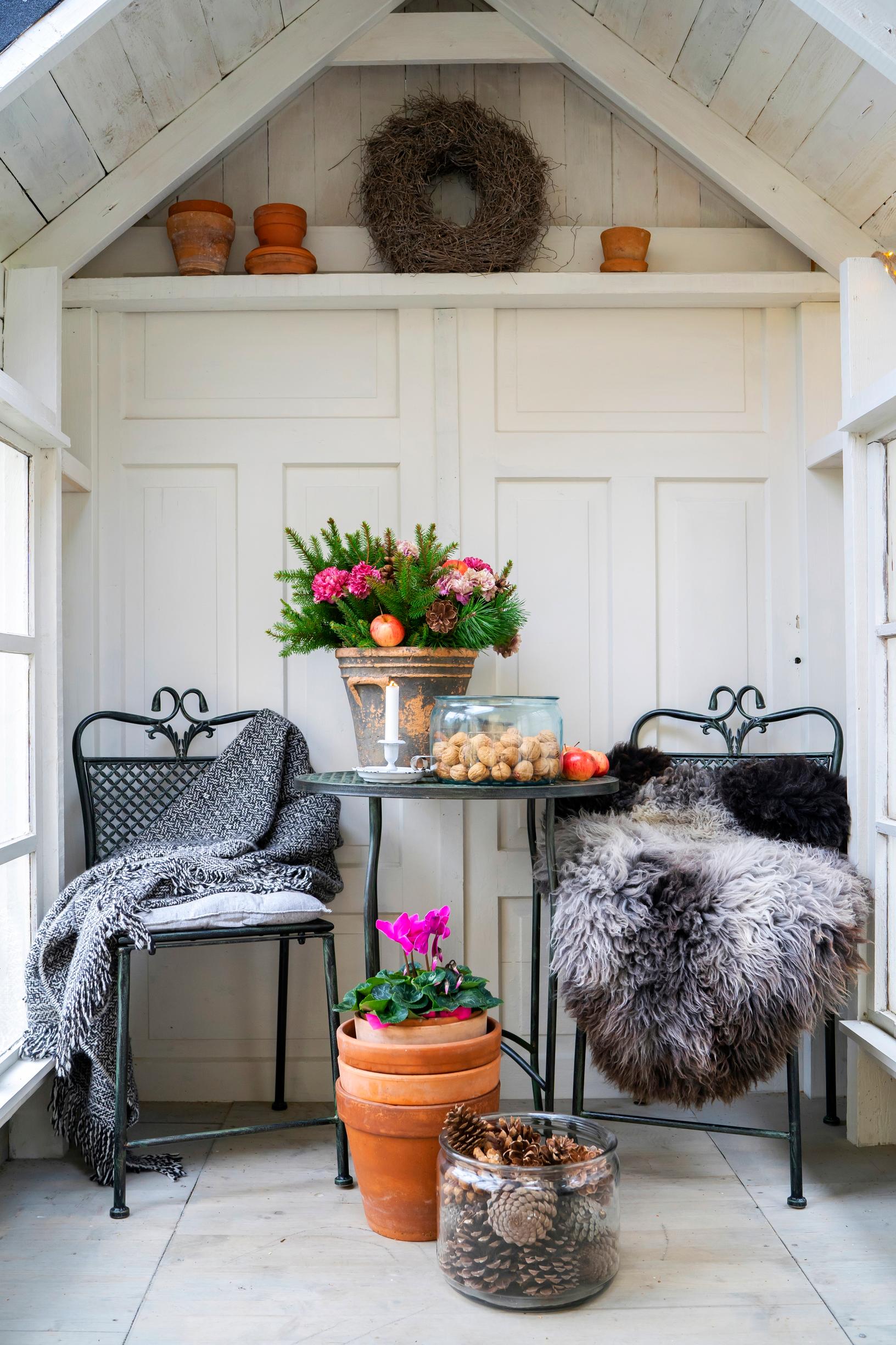 Joku voisi pitää tätä rakennusta turhana, mutta minulle se on paras rentoutumispaikka. Olen innokas sisustaja ja rakastan asetelmien tekemistä ja paikkojen somistamista. Nyt minulla on kodin lisäksi pikkuruinen talo niitä varten. Tunnelma muuttuu täällä jokaisena vuodenaikana. Tänään täällä tuoksuu omenille ja kanelille. Hetken päästä kuura tekee ikkunaruutuihin kukkasensa.
