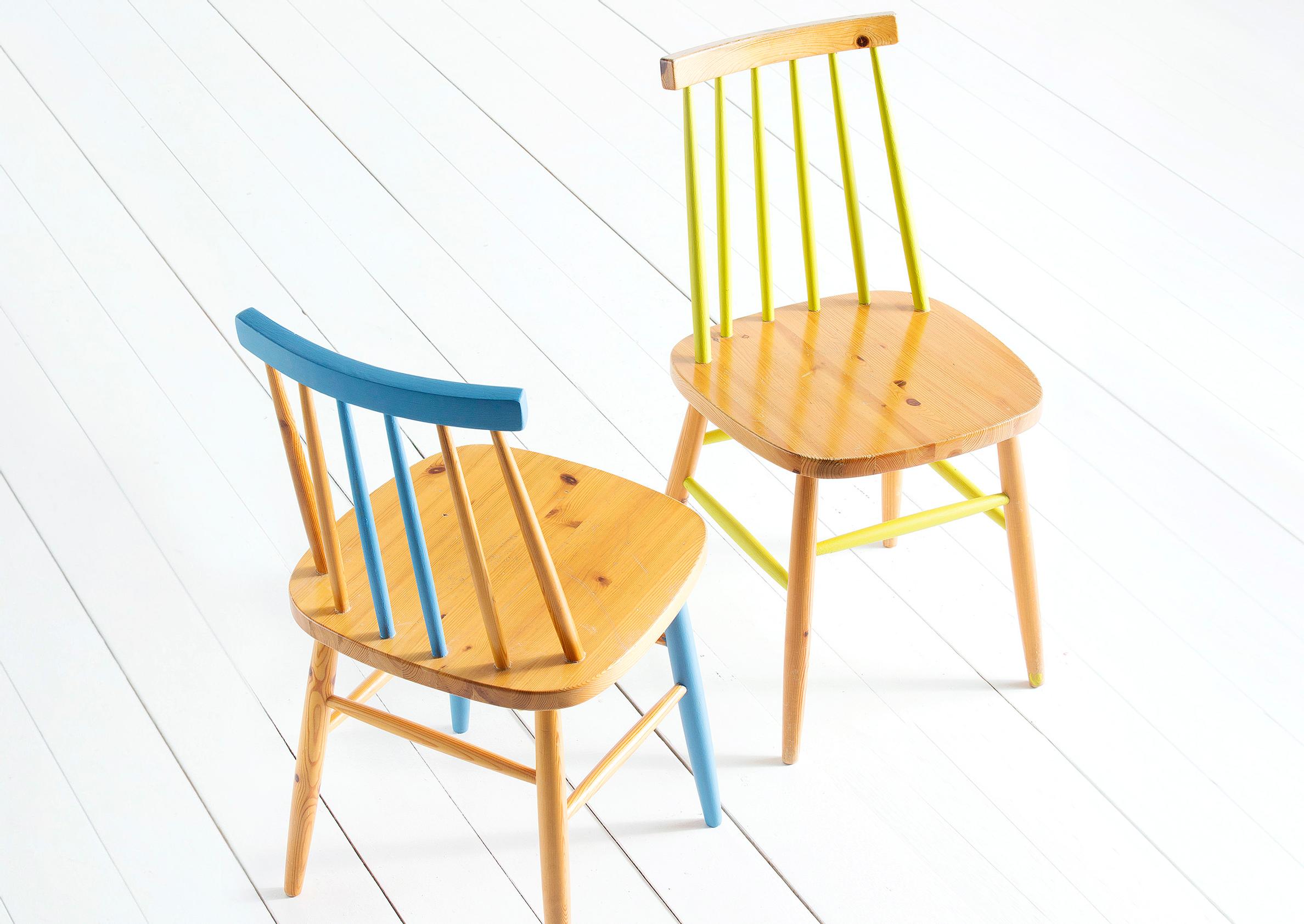 Puupintaiset, nuhjuiset pinnatuolit heräävät uuteen loistoon maalinjämillä.